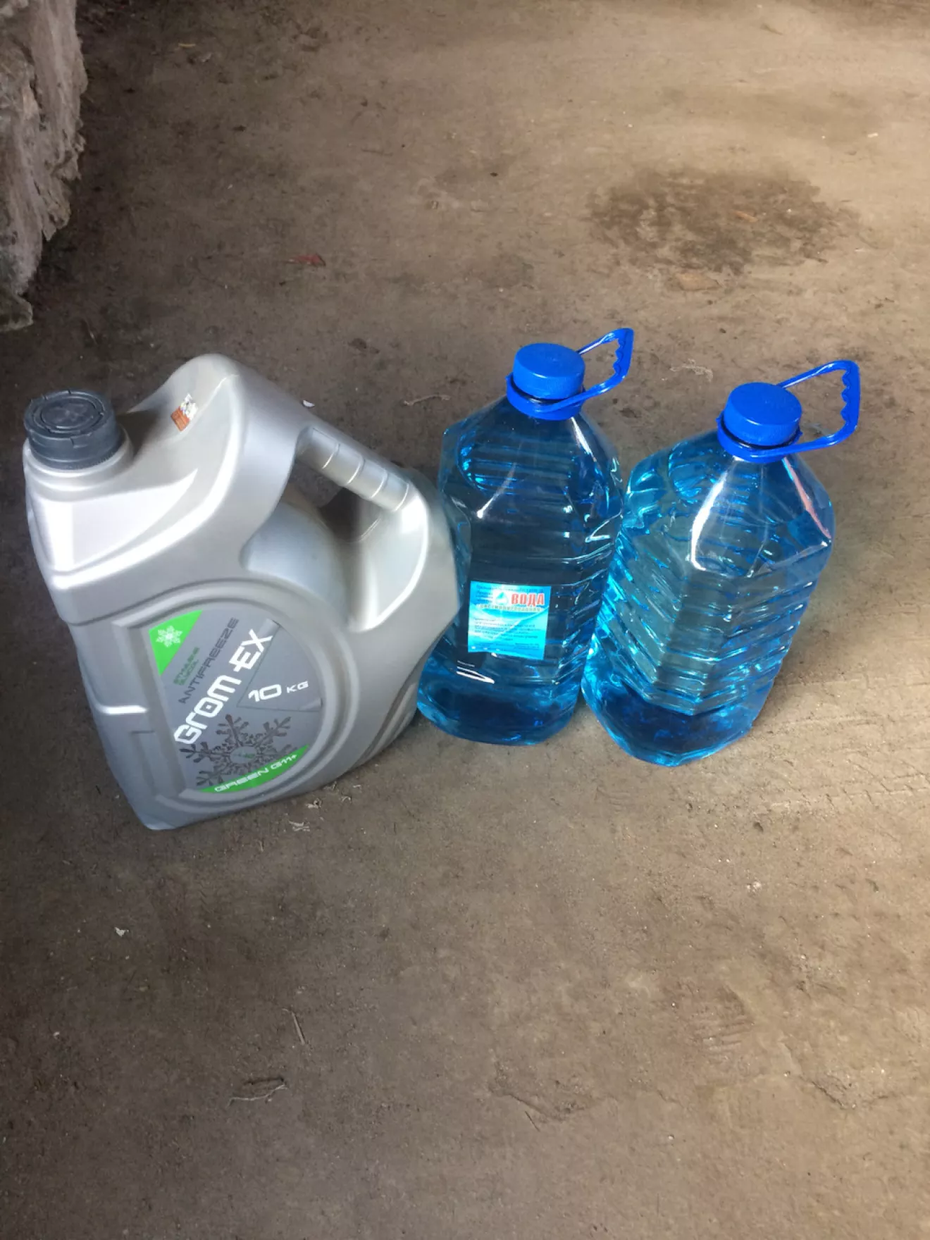 Купил 10л жидкости (фото) и 10л дистиллированной воды (для промывки системы). Перед началом процедуры, дал машинке остыть. Затем сбросил давление в бачке, и открутил пробку на радиаторе (ключик на 13, для удобства использовал трещетку). Слил старую ОЖ (хотя это было похоже на нечто другое). Чтоб больше слилось, приподнял заднее левое колесо, также в процессе и переднее попробовал, и плюс использовал компрессор чтоб больше выгнать жидкости (на патрубке который слева бачка)(а сам бочек заткнул старым датчиком температуры, он отлично подошел). Также прокачивал самые толстые патрубки которые чуть пониже возле радиатора, это дало небольшой слив жидкости. Затем закрыл пробку на радиаторе, патрубок, и залил воды. Прогрел машину до рабочей температуры, и в той же последовательности промыл систему два раза. Залил ОЖ. И вуаля зелененькая чистенькая. Конец