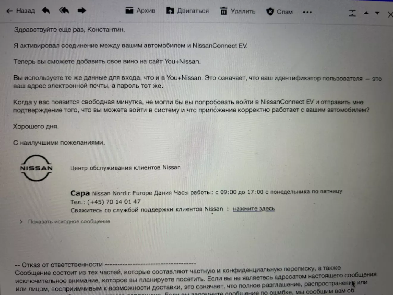 В завершение — последнее письмо, полученное от технической поддержки Nissan: