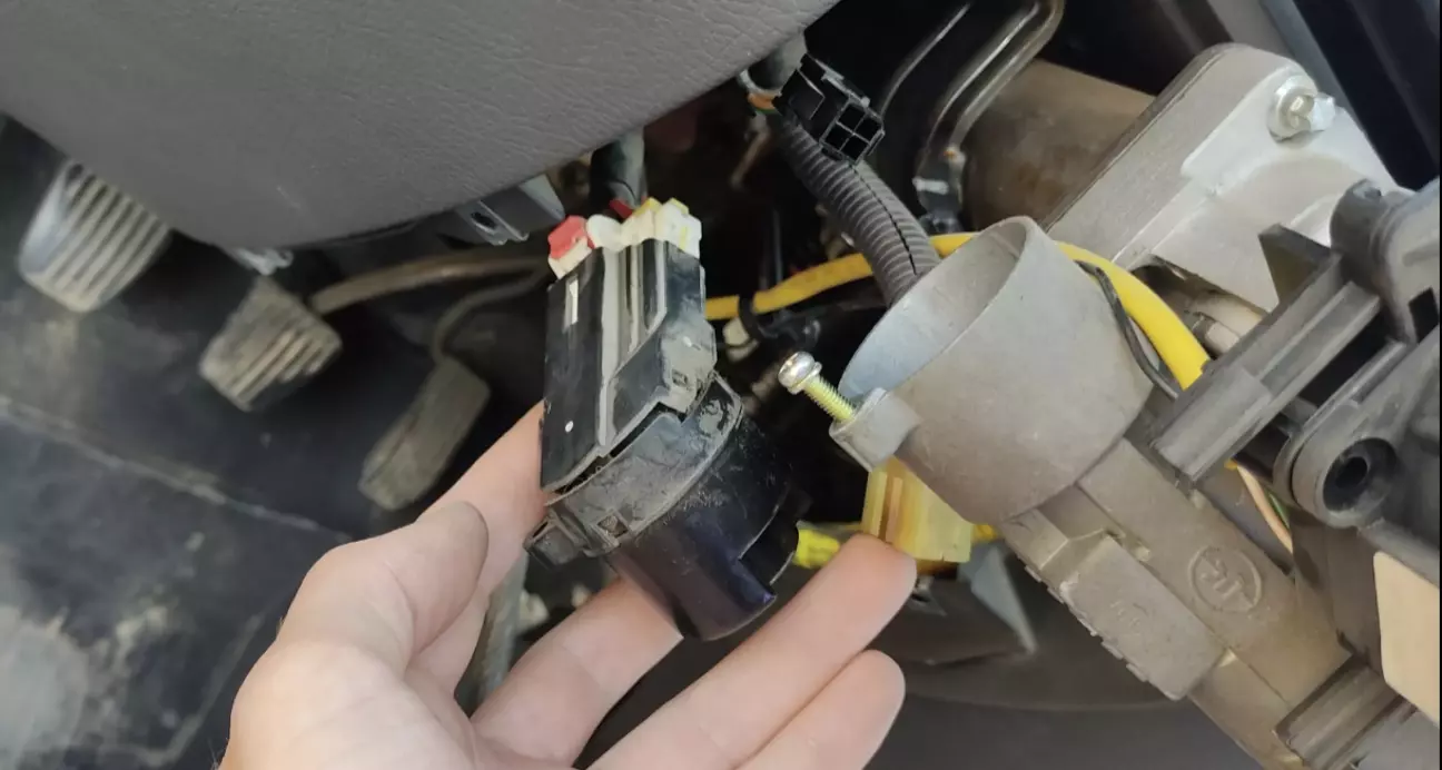 Аккуратно приподнимаем модуль подушки безопасности, слегка наклоняем на себя, отключаем разъём провода звукового сигнала, освобождаем фиксатор жгута проводов подушки безопасности и маленькой отвёрткой поддеваем сам разъём подушки безопасности.