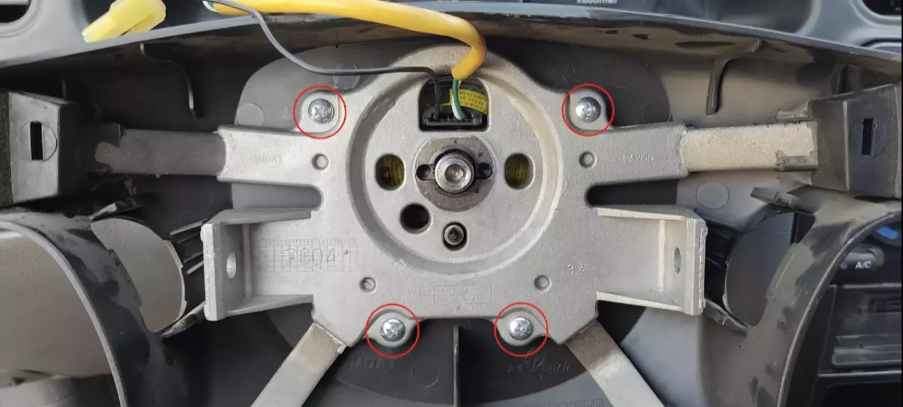 Далее ключом/торцевой головкой на 22 откручиваем гайку крепления рулевого колеса и наносим метки на сам вал и руль. Устанавливаем колеса прямо, откручиваем 4 винта задней накладки руля.Затем возвращаем гайку на вал, накрутив её на несколько витков резьбы. Руль на ланосе подпружинен, а гайка не даст нанести себе травму. Устанавливаем съёмник и снимаем руль.
