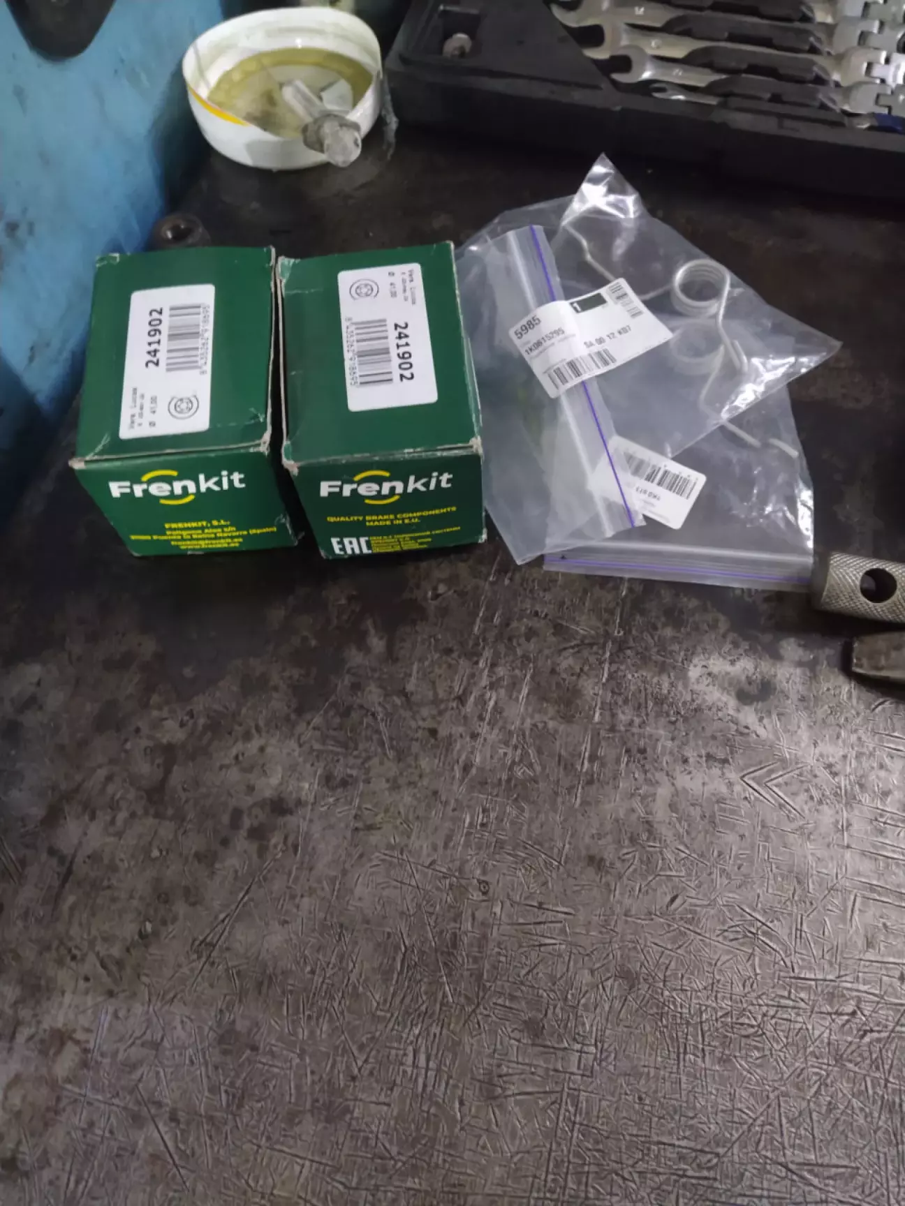 Історія яка застала якось несподівано. Весною робив діагностику ходової і всі технічних рідин, сказали наче все ок, тільки гальмівна рідина, замінив рідину через тиждень і поїхав далі, і тут осінь, в один чудовий день після гальмування з маленької швидкості почув якийсь скрип позаду, виявилось що почав підклинювати супорт і причому один дуже сильно, так що аж стер колодку майже повністю( Тому міняв колодки, ставив Textar (рекомендував ще два роки тому механік, і самому сподобались, ставив на перед) і було прийнято рішення міняти ремкоплекти супортів з поршеньками, зупинився на виробнику Frenkit, і паралельно вирішив замінити пружинки супортів, недорого коштували як за оригінал, подумав гуляти так гуляти)