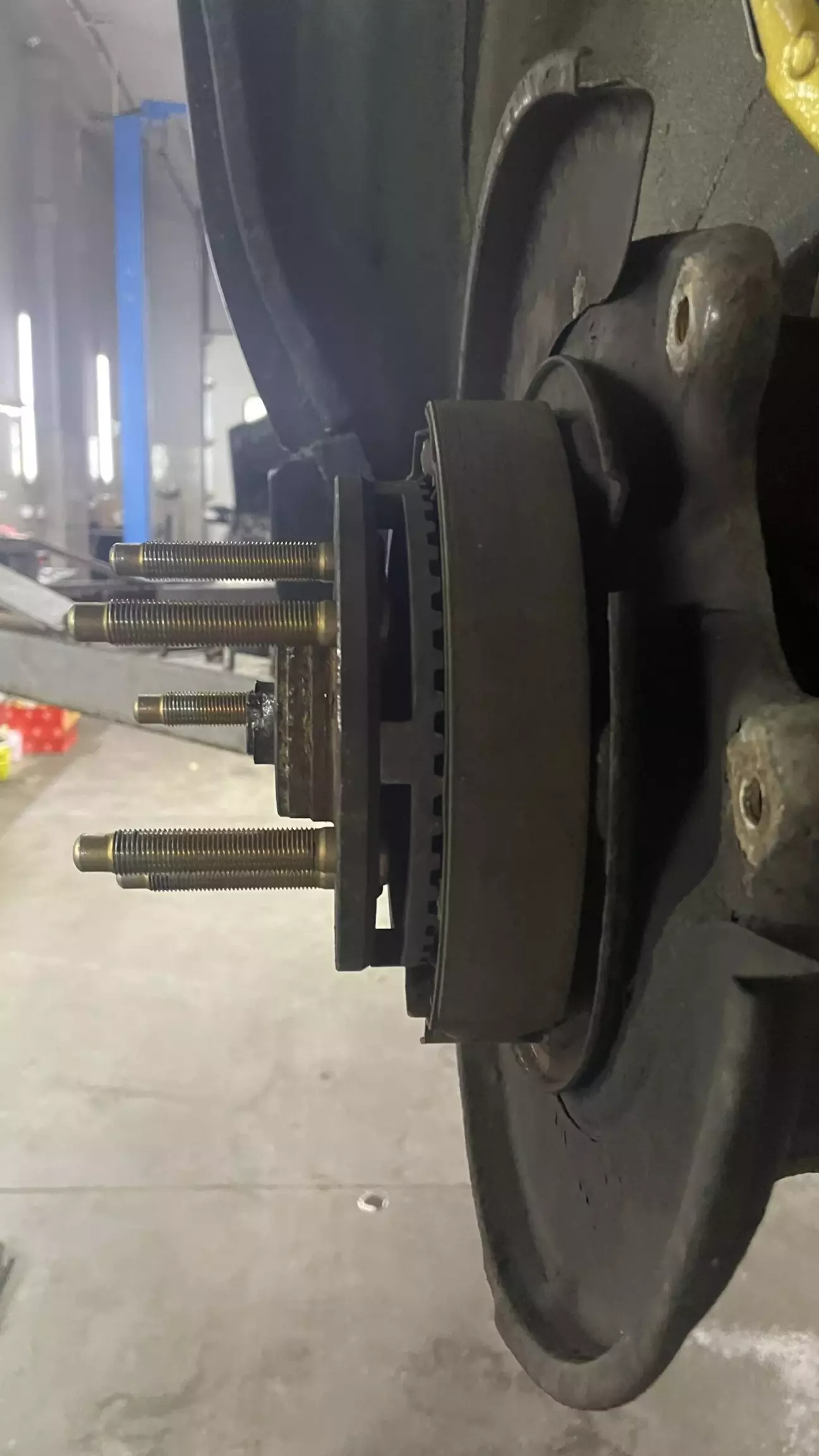 Також на задньому лівому колесі під час затягування шпильок пневмопістолетом від вібрації тріснув вінець ABS (або він вже був тріснутий до цього, ми з майстром так і не зрозуміли точно). Дуже часта проблема, з чого такого їх роблять крихкого і чому для мене загадка. Тріщину залили клеєм, прикрутили вінець на місце і схрестили пальці в надії що помилка по ABS через це не засвітиться.