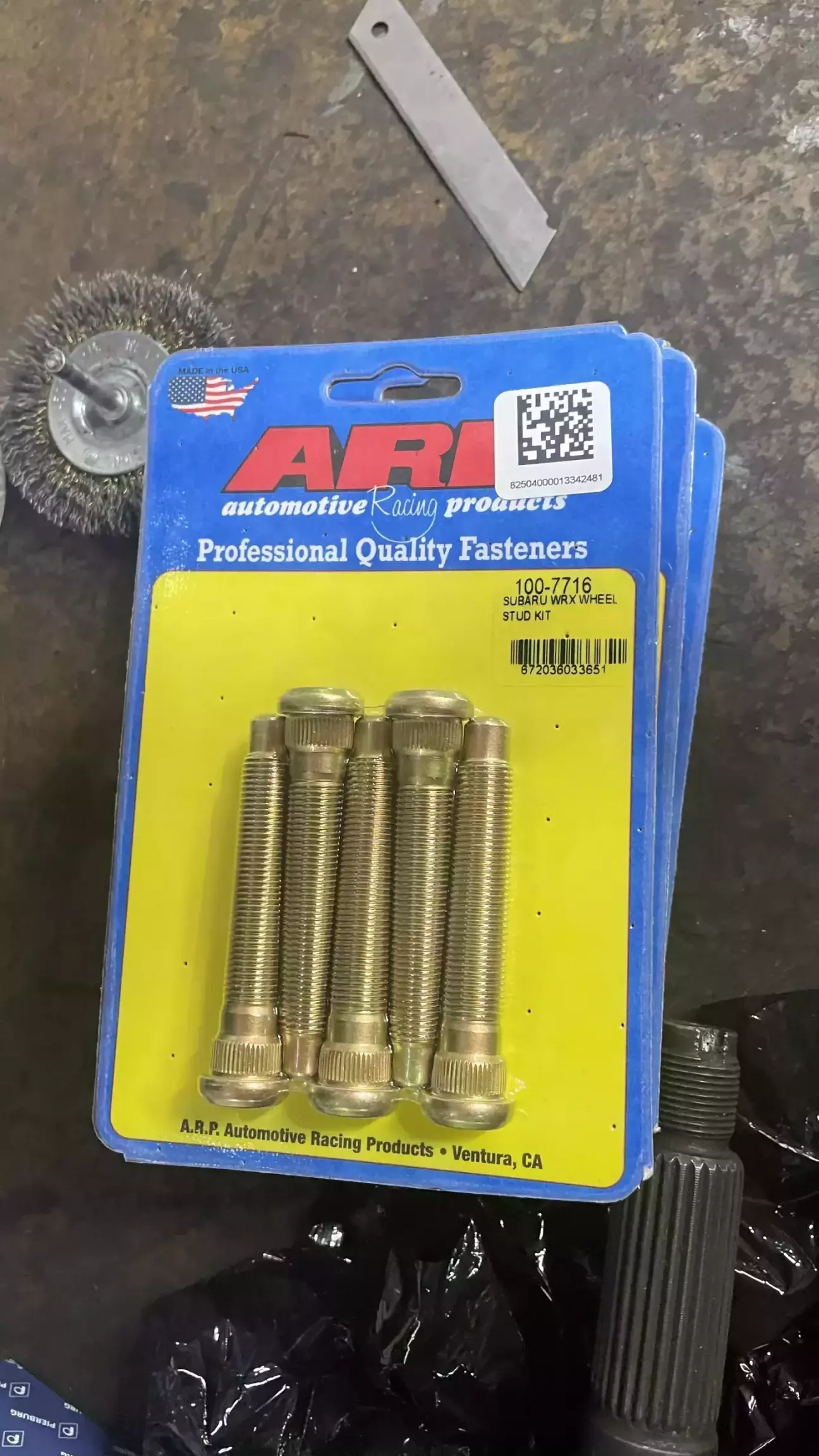 Встановив подовжені ступичні шпильки ARP замість штатних на всі колеса. Потрібні вони щоб можна було встановити колісні диски з проставками 10мм і щоб при цьому вистачило різьби на шпильках щоб надійно прикрутити колеса (довжини штатних шпильок замало для такого).