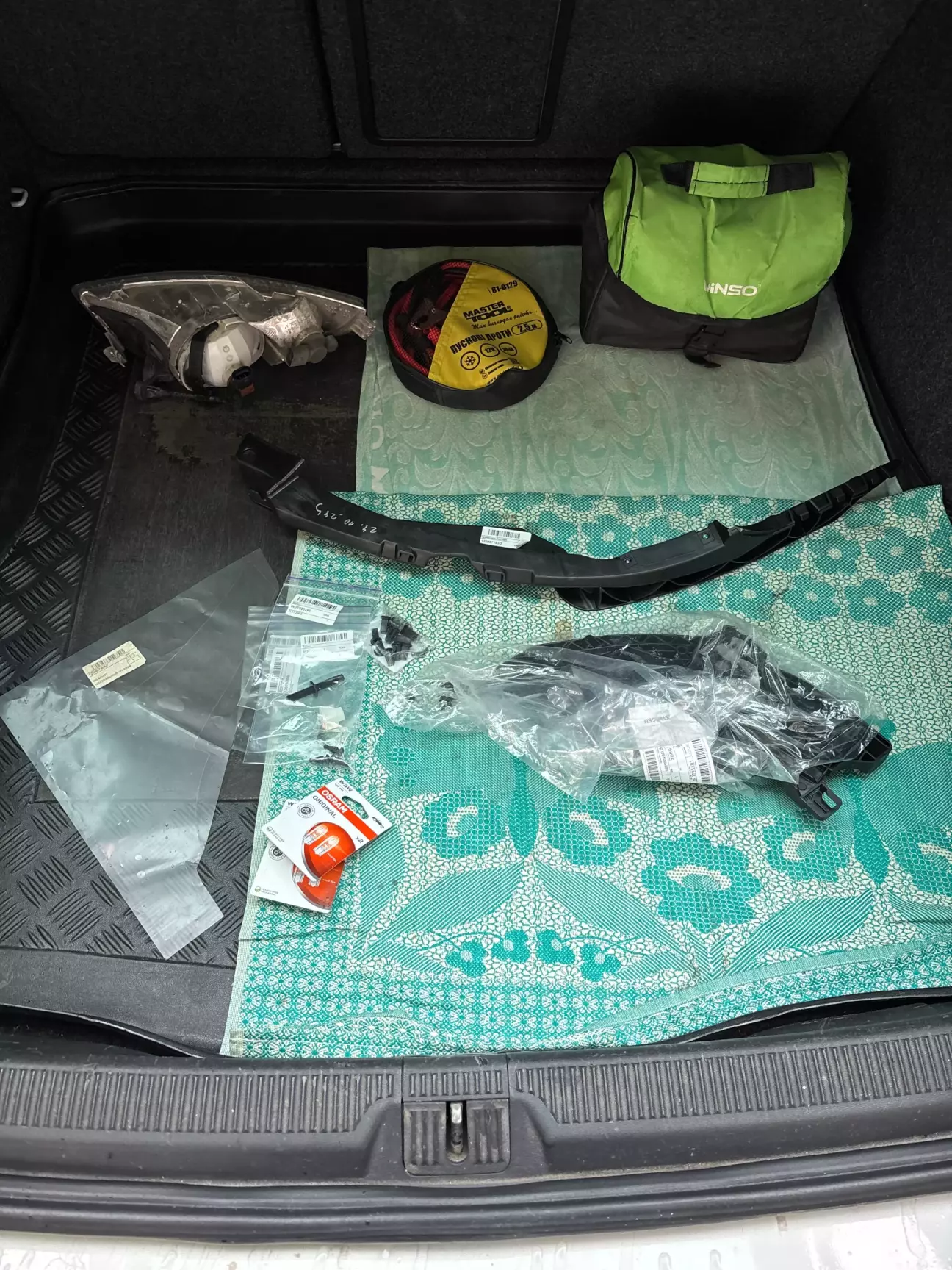 Зробили тимчасове рішення, поки запчастини з'їдуться, зняти туманку, пошкодилось кріплення фари, тому фару на стяжки, і трішки вигнути бампер