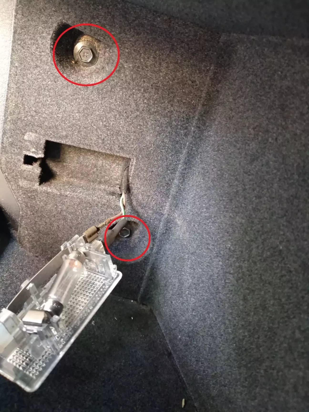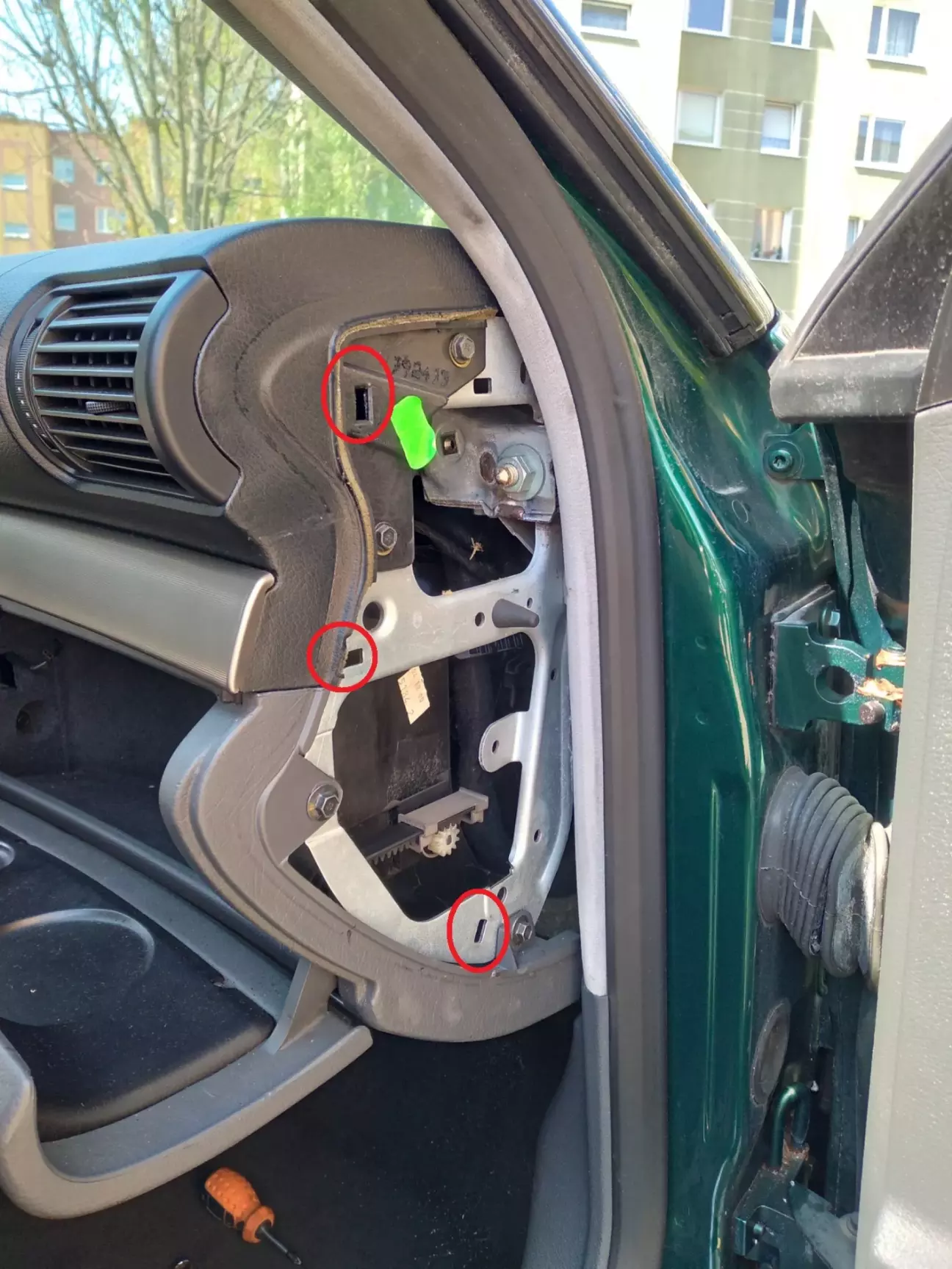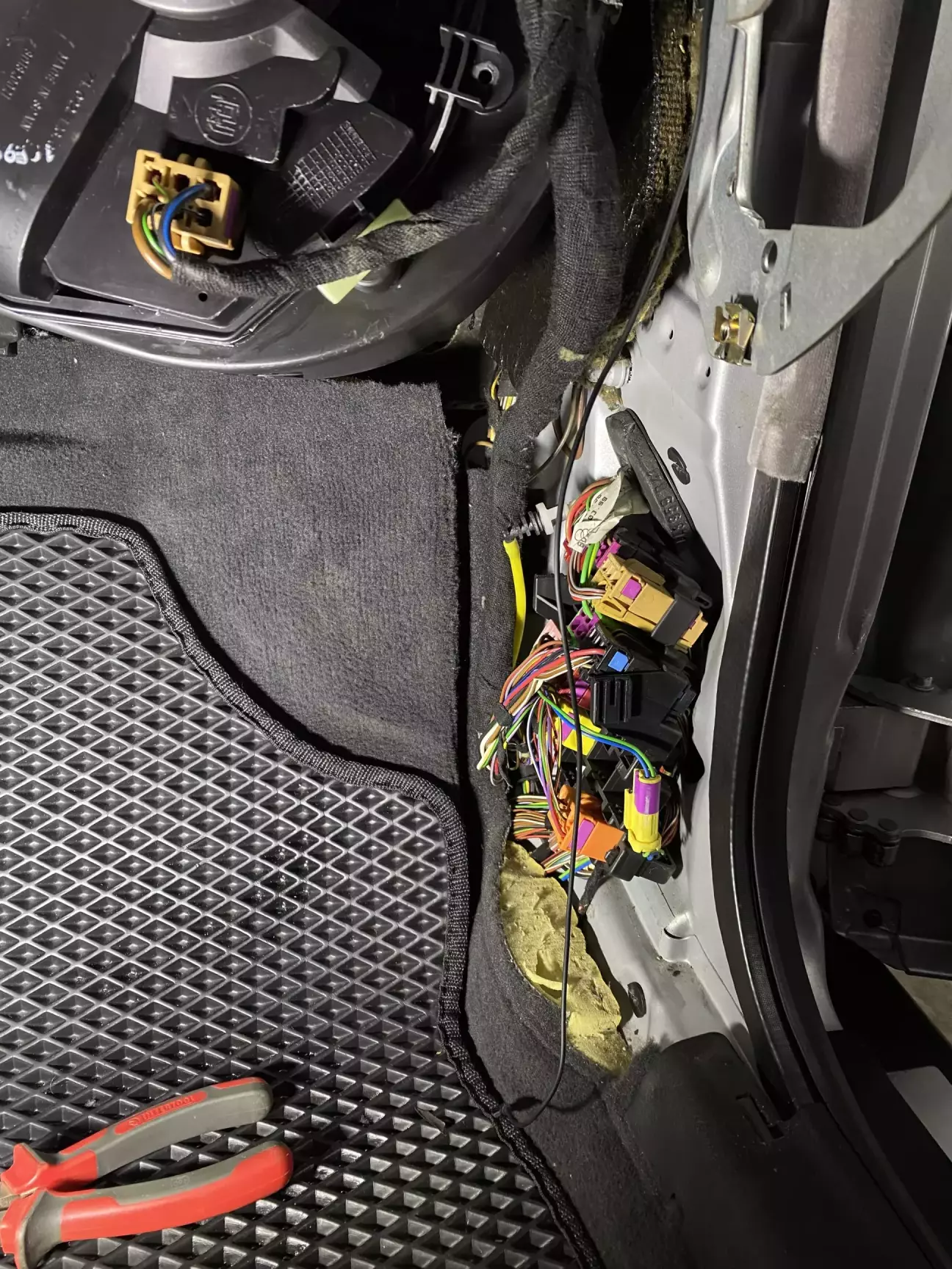 Заодно, хотів перевірити чи не забита дренажна трубка під ковроліном, знімаю бокову накладку у ногах тримається на 2 саморізах, один зверху, один знизу під заглушкою, трішки натискаємо вперед до моторного щита і відводимо в бік, бо на самій кришці маємо фіксатор внизу (ніжку) яка заходить в планку порогу щоб не поламати)