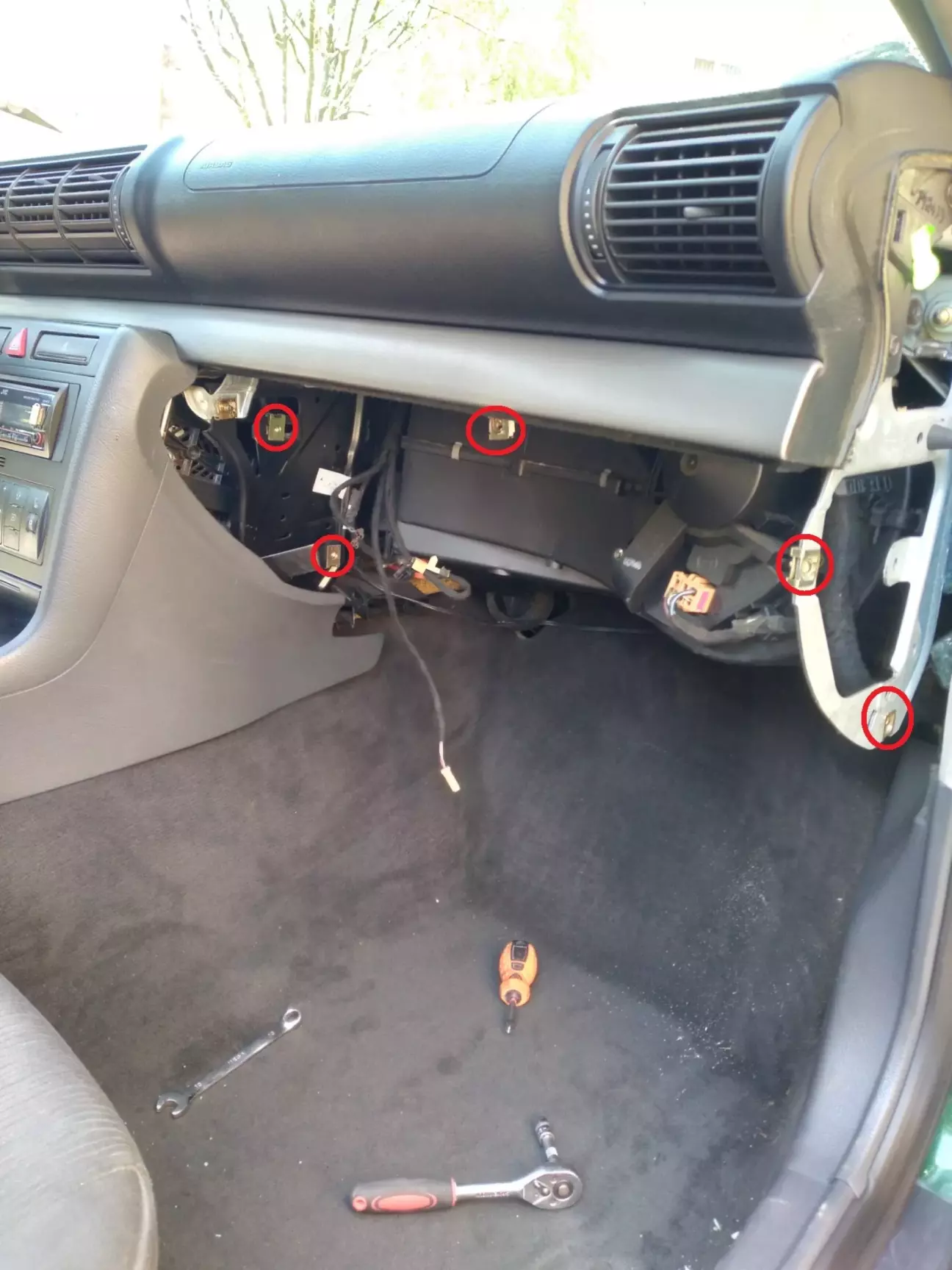 Приступив до зняття бардачка, ключик на 8, і зправа на торпеді потрібно зняти бічну кришку, 5 болтів і бардачок пішов на задній диван, не забудьте електрику від'єднати, підсвічування всередині бардачка і підсвічування ніг. Фото нижче з інтернету.
