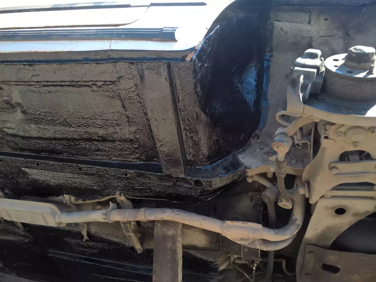 Замінили підсилювачі та трішки металу, де вони приварюються. Напівавтомата тоді ще не мав, батько все поварив звичайною зваркою електродом 2мм, далі грунт та мастика відповідно. Знімав підкрилки передні, підварили місце де стоїть відбійник. Впринципі весь кузов був в досить класному стані, ще в заводському антикорі.