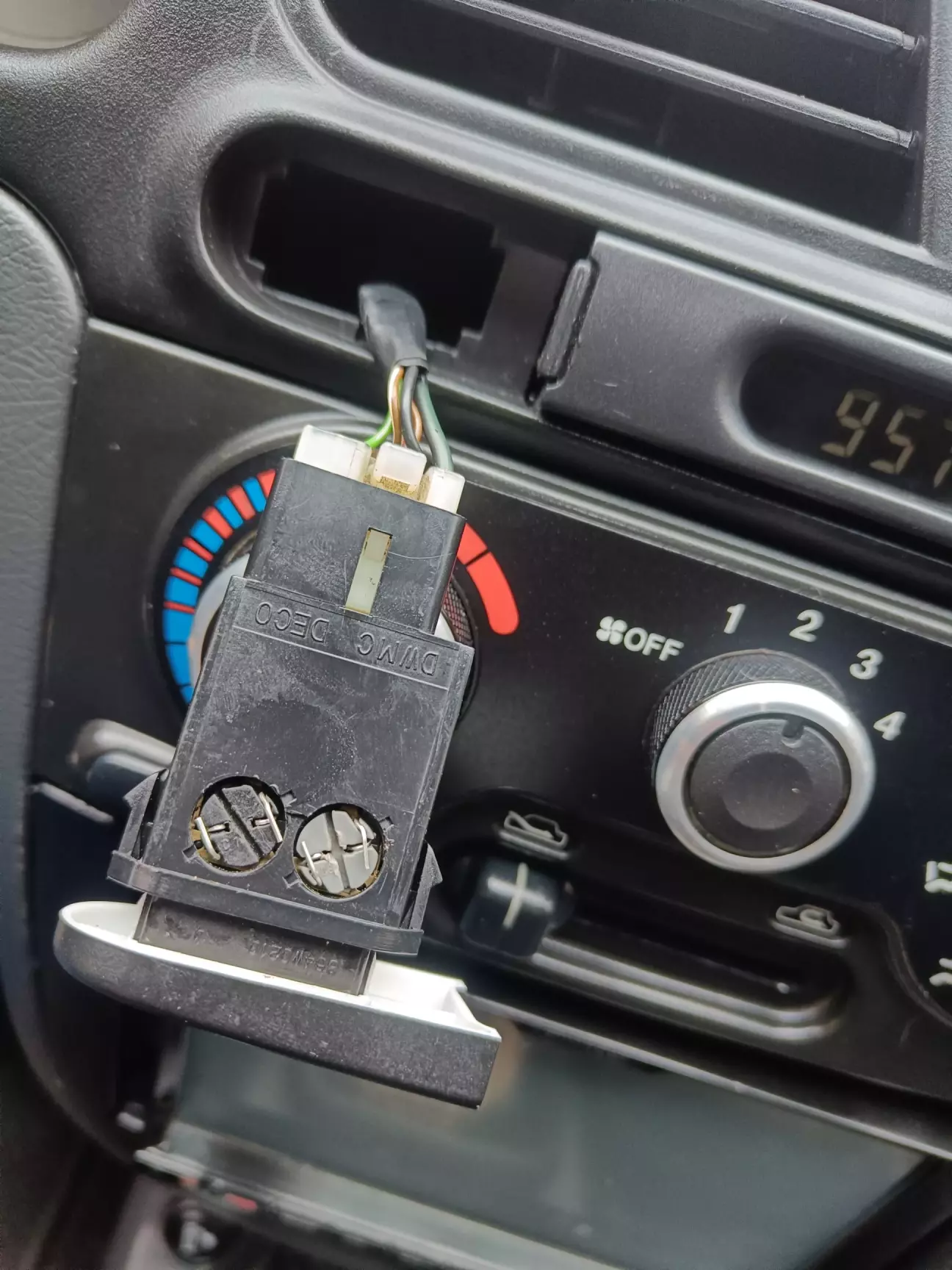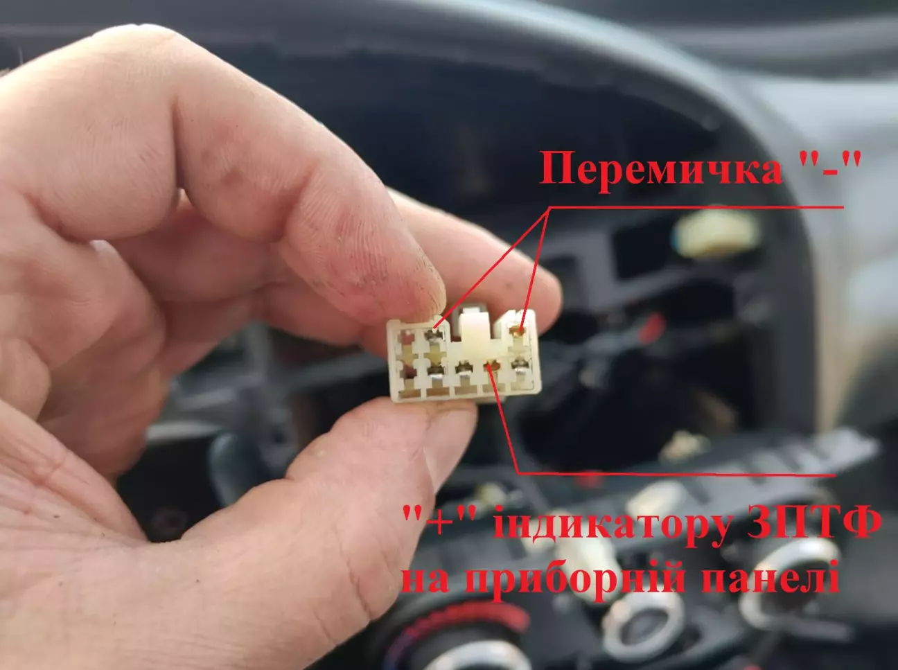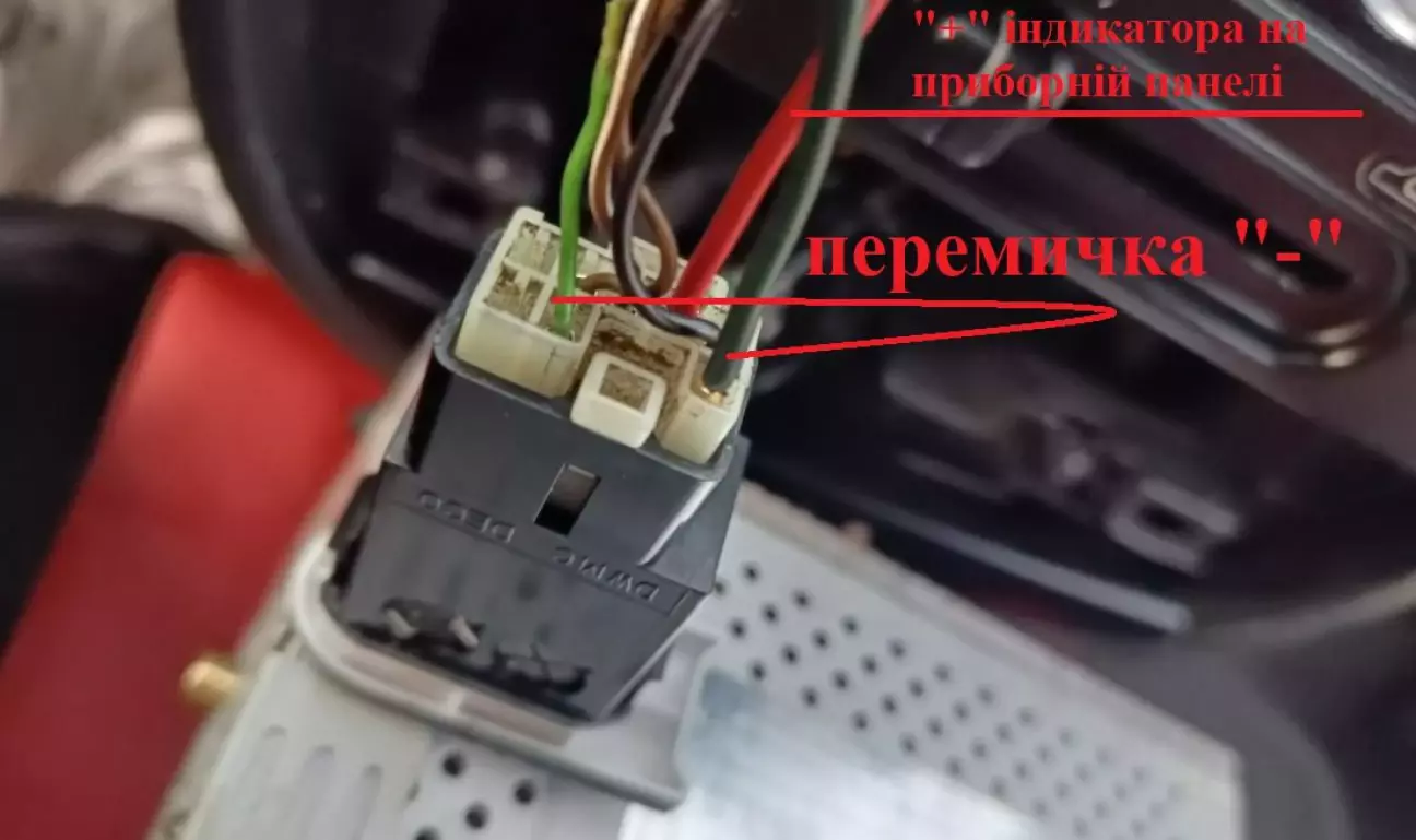 Обжимаємо клемки і встановлюємо на місце, один дріт це плюс від індикатора на приборній панелі, інший мінус, беремо його з сусіднього контакту зробивши перемичку.