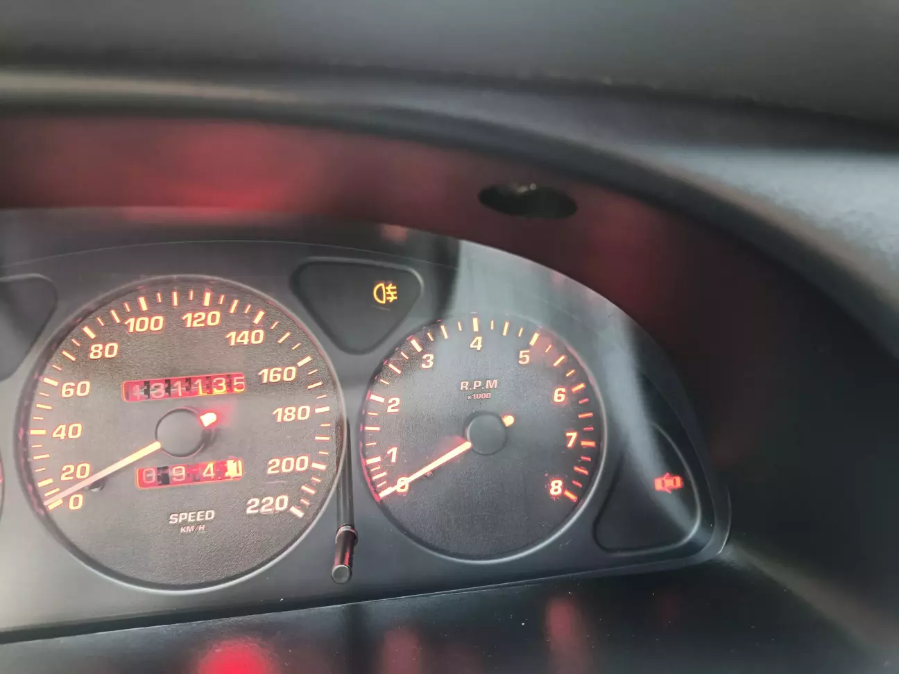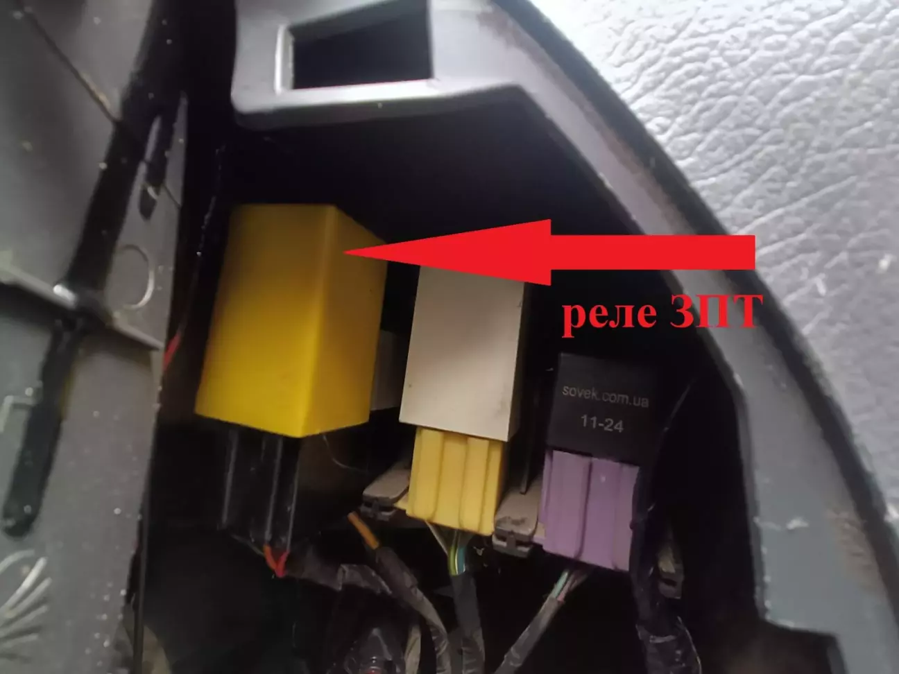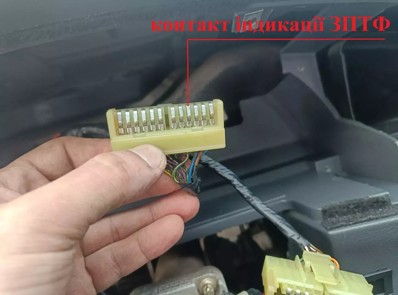 Підключаємо до індикатору ввімкнення ЗПТФ, 17 pin, або ж четвертий контакт з права на центральній колодці приборної панелі з тахометром.