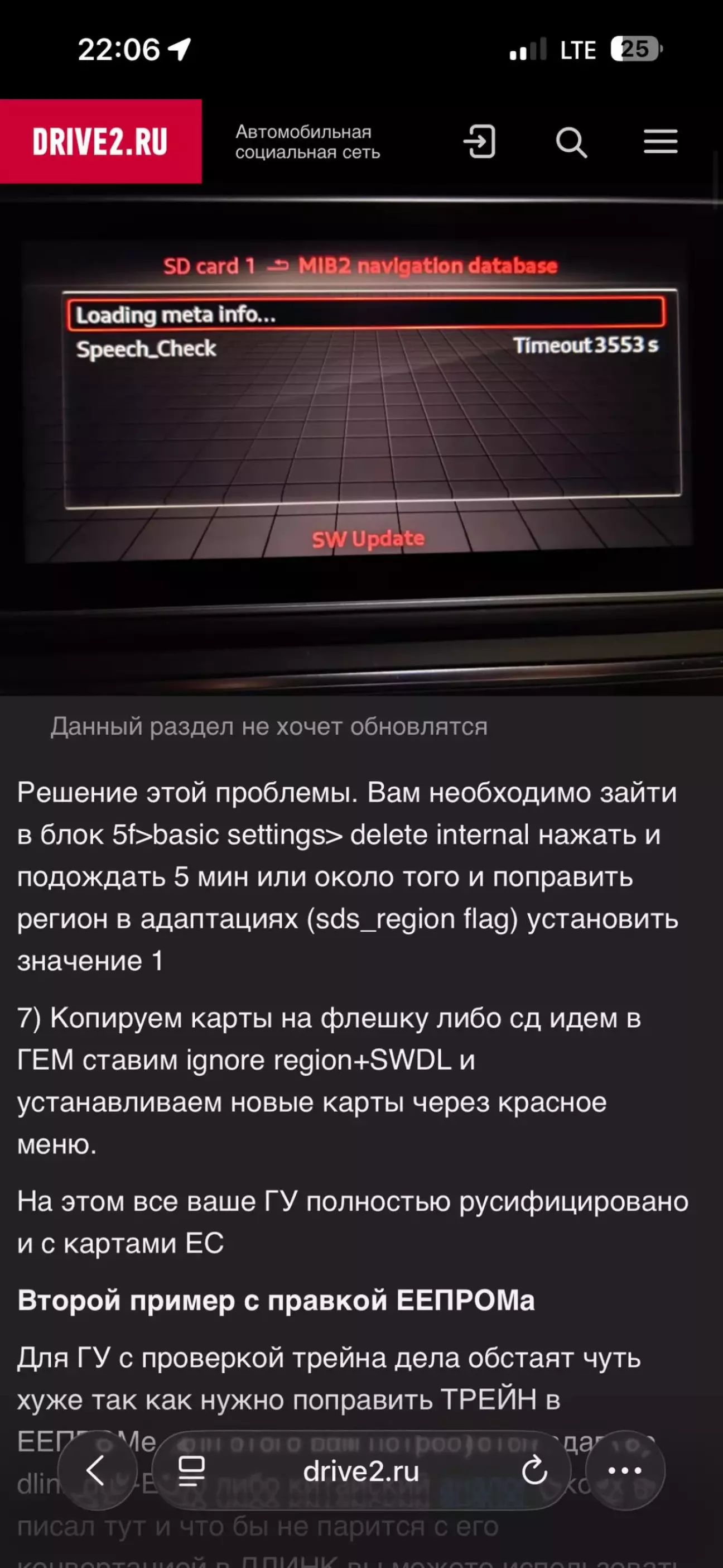 Треба видалити стару базу, якщо у вас vcds на руском, то заходите в ті блоки перекладаючи, і шукаєте щось про видалення чогось там, воно ніби має бути єдине у списку, десь по середині. Запускаєте, у вас там буде грузитись, показувати семпли, і писати 'процеса нет', це значить воно видалило або ще довидаляє(я сидів десь 10хв з надією що воно скаже щось типу "готово", не дочекався). Зберігаєте і виходите. У mmi дивитесь чи є у вас якась база даних по навацігації, якщо там нема версії значить все супер. Перевіряєте sds_region flag. Заново ставити оновлення карт. Після цього маєте отримати отаке вот