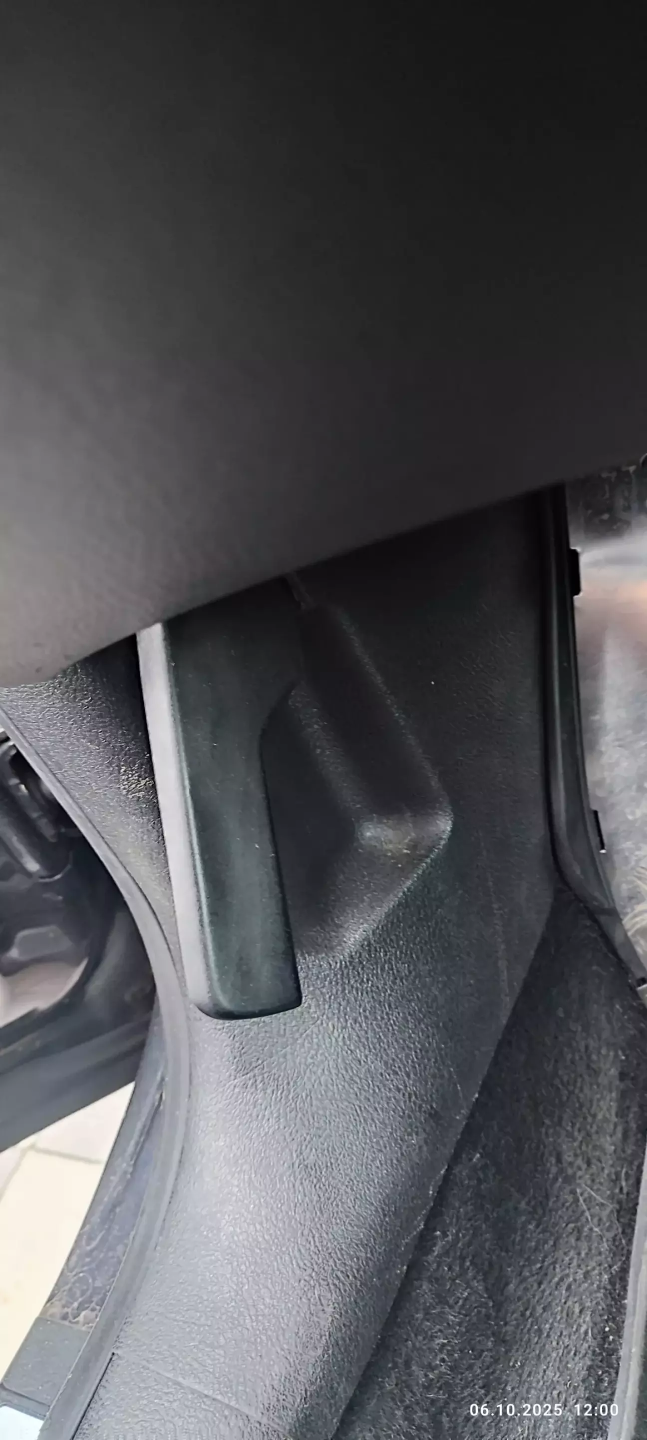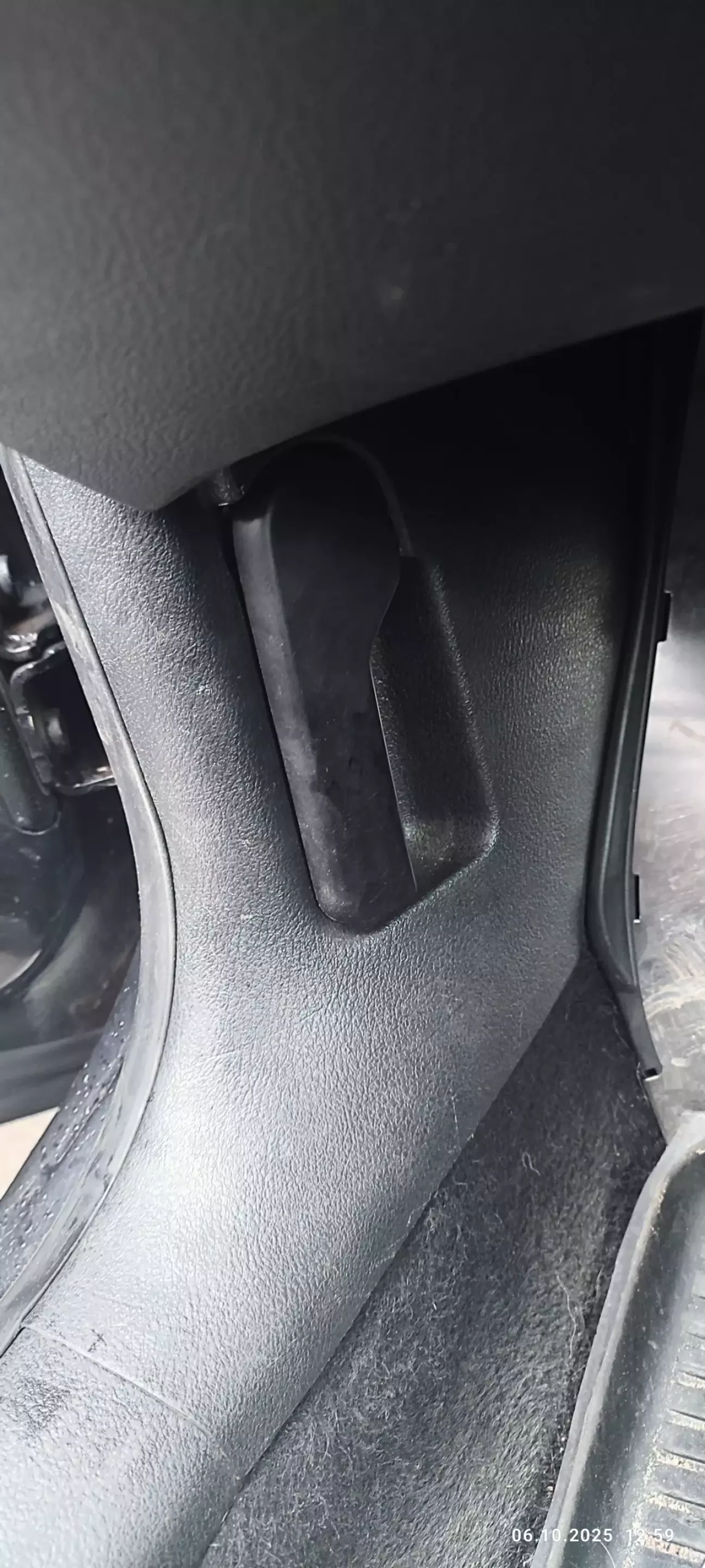 Знімаю пластик в ногах. Для цього треба витягти фіксатор з ручки, спереду є щілина, туди засовуємо плоску викрутку, витягуємо фіксатор та тягнемо ручку вперед по осі; після того - знімаю пластик, він на 2х металевих кліпсах. і от картина така