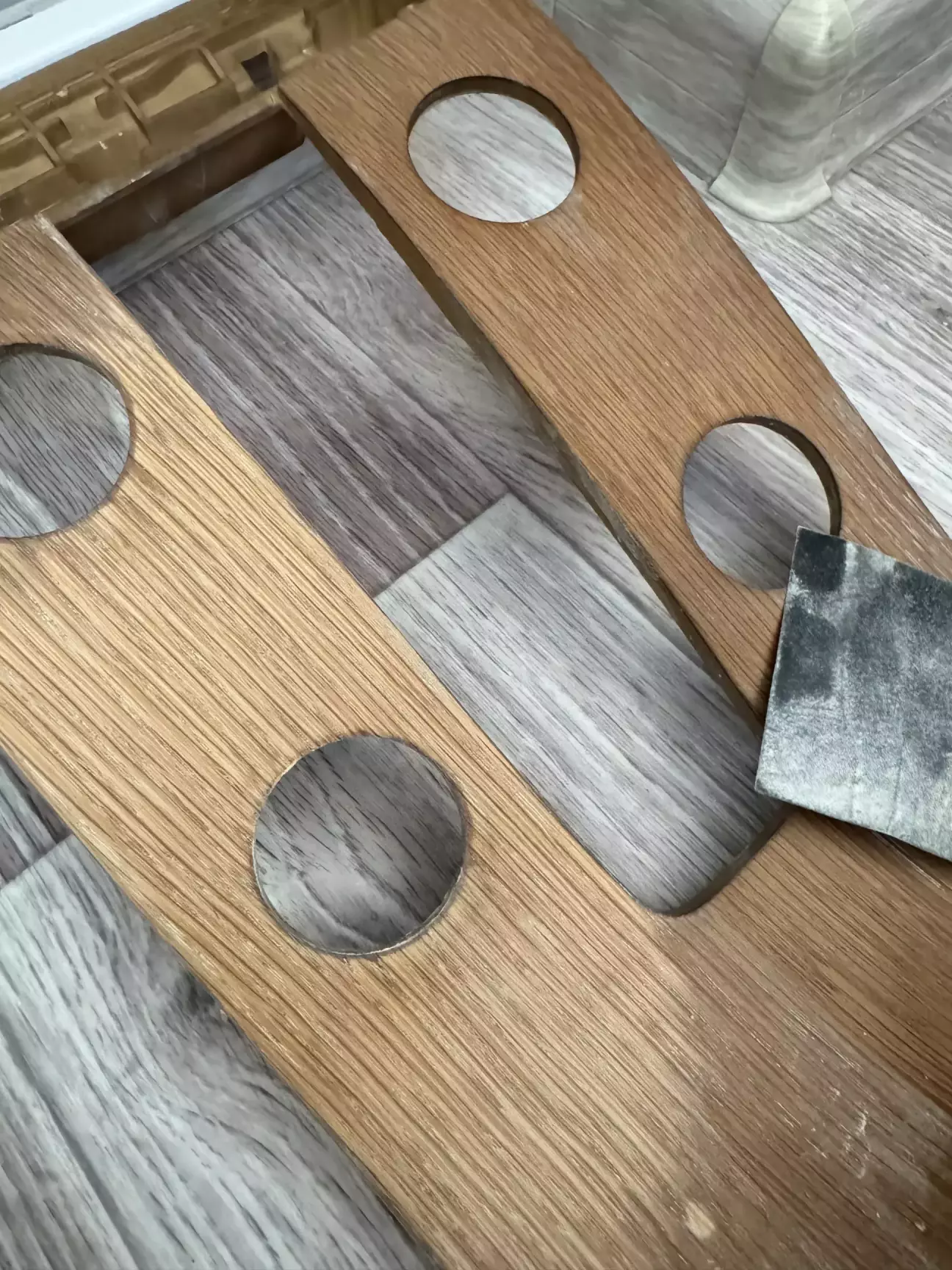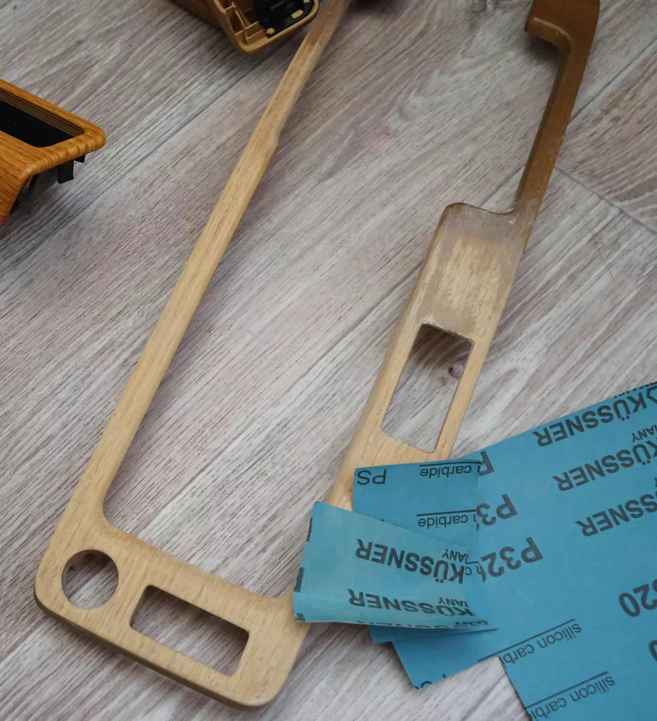 Власне нічого магічного наждачка 320 і вперед, єдине на що треба звернути увагу це те що товщина шпону 1мм може і тонше, протерти його можна на раз два.