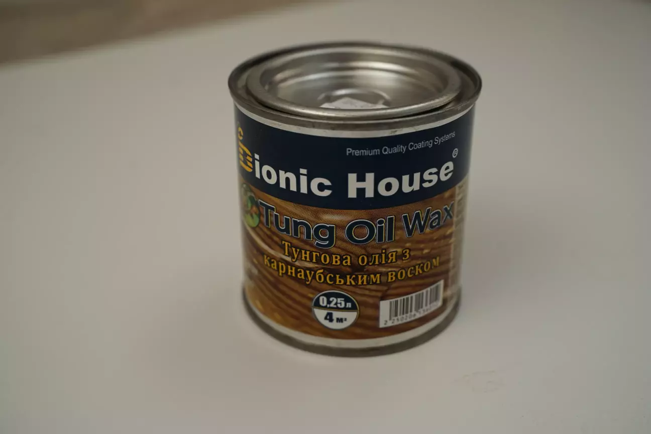 Покривав все це добро безбарвною тунговою олією з карнаубським воском в 2 шари по 24-ри години висихання. банки 0.25 л вистачило с головою.