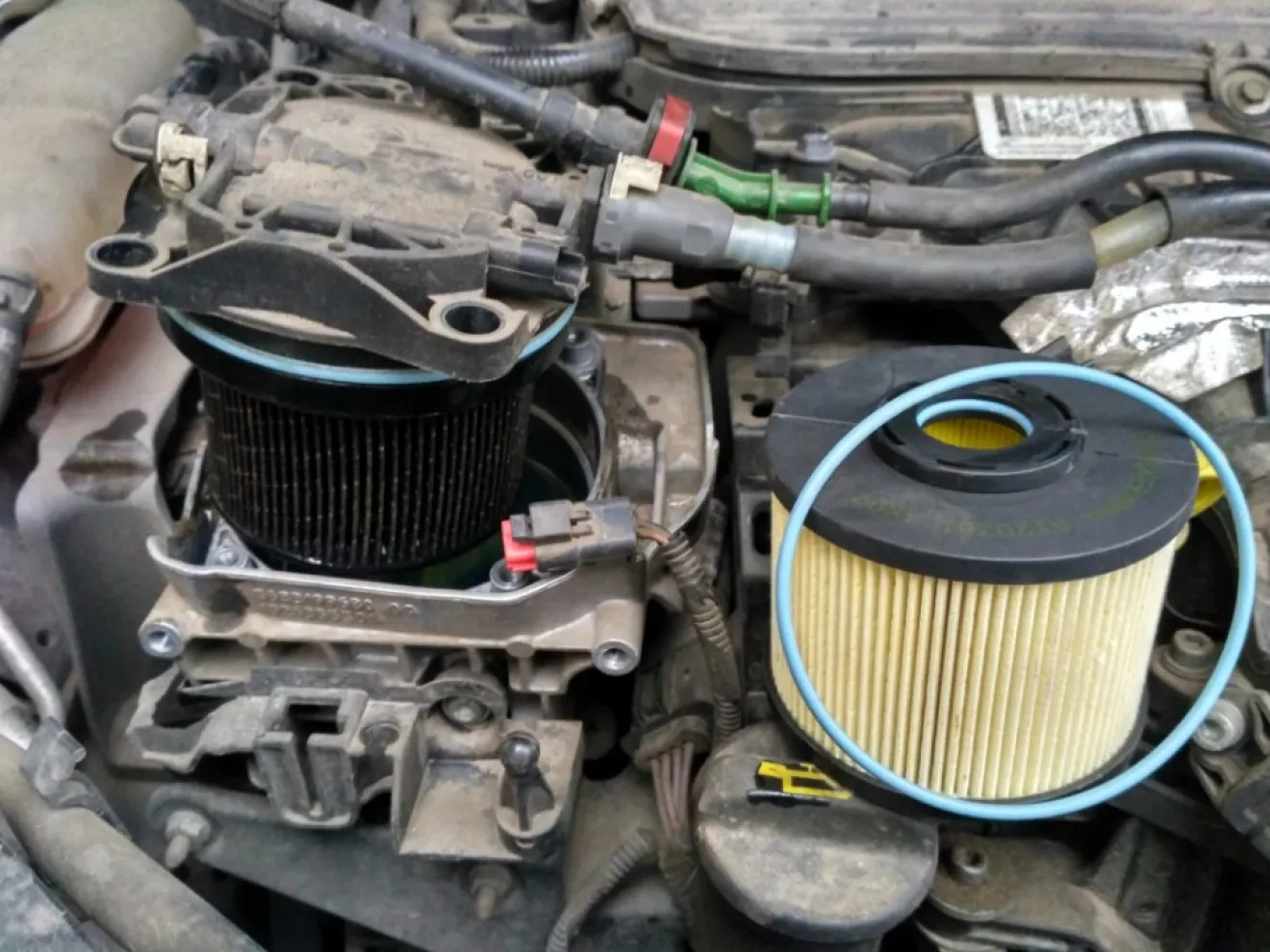 По замене топливного, отсоединить разъем проводки, открутить кронштейн слева, ну собственно ничего сложного нет, предварительно желательно "замочить" фильтр в топливе, что бы не завоздушивать систему, в данном случае это солярка, сверху крышки фильтра там есть "болт" пластиковый под крестовую отвертку, в него доливаем топливо, пока через верх непошло, заворачиваем, излишки топлива протираем, и все, можно заводить.