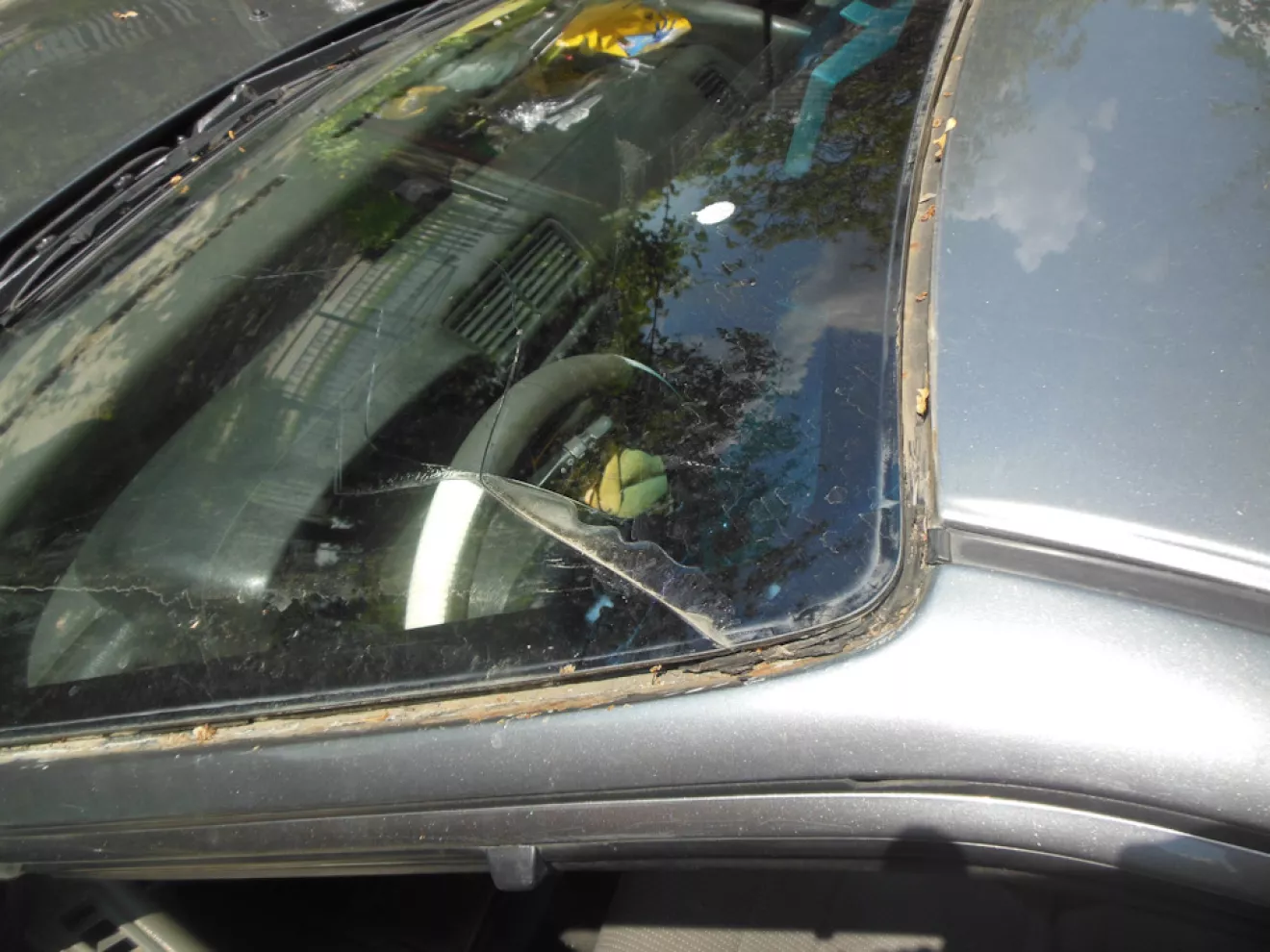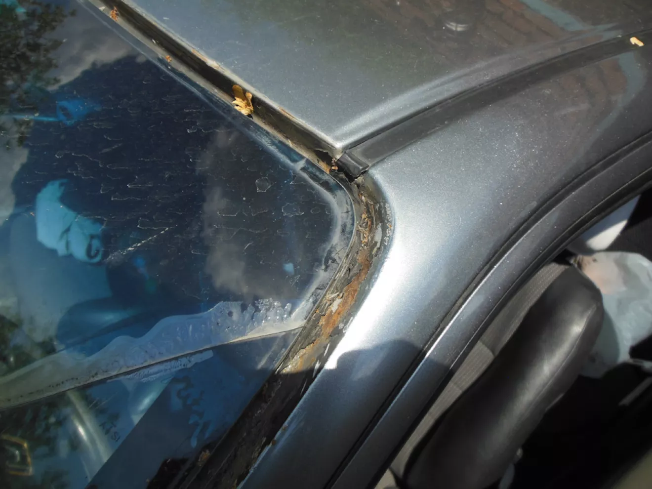 Всем драсти, как писал раннее во тут были подозрения на молдинг, таки да таки он, а именно, излишний клей стекла которого быть в том месте не должно, на пути стока воды, в следствии чего образовалась коррозия, которая начала поднимать клей с молдингом, в следствии чего оно и выдавило стекло с угла.