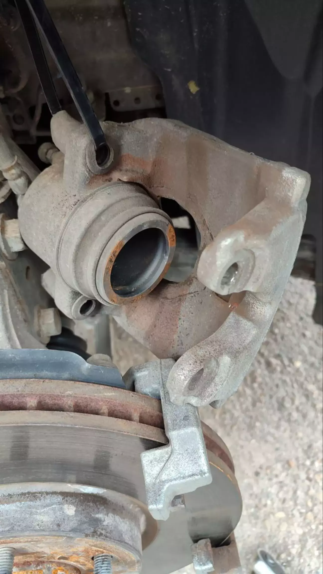 Далі переходимо до суппорта для початку потрібно зняти скобу щоб її зняти потрібно її піджати руками і викруткою піддіти, потім переходимо до самого суппорта щоб його зняти необхідно зняти дві пластикових заглушки на направляючих