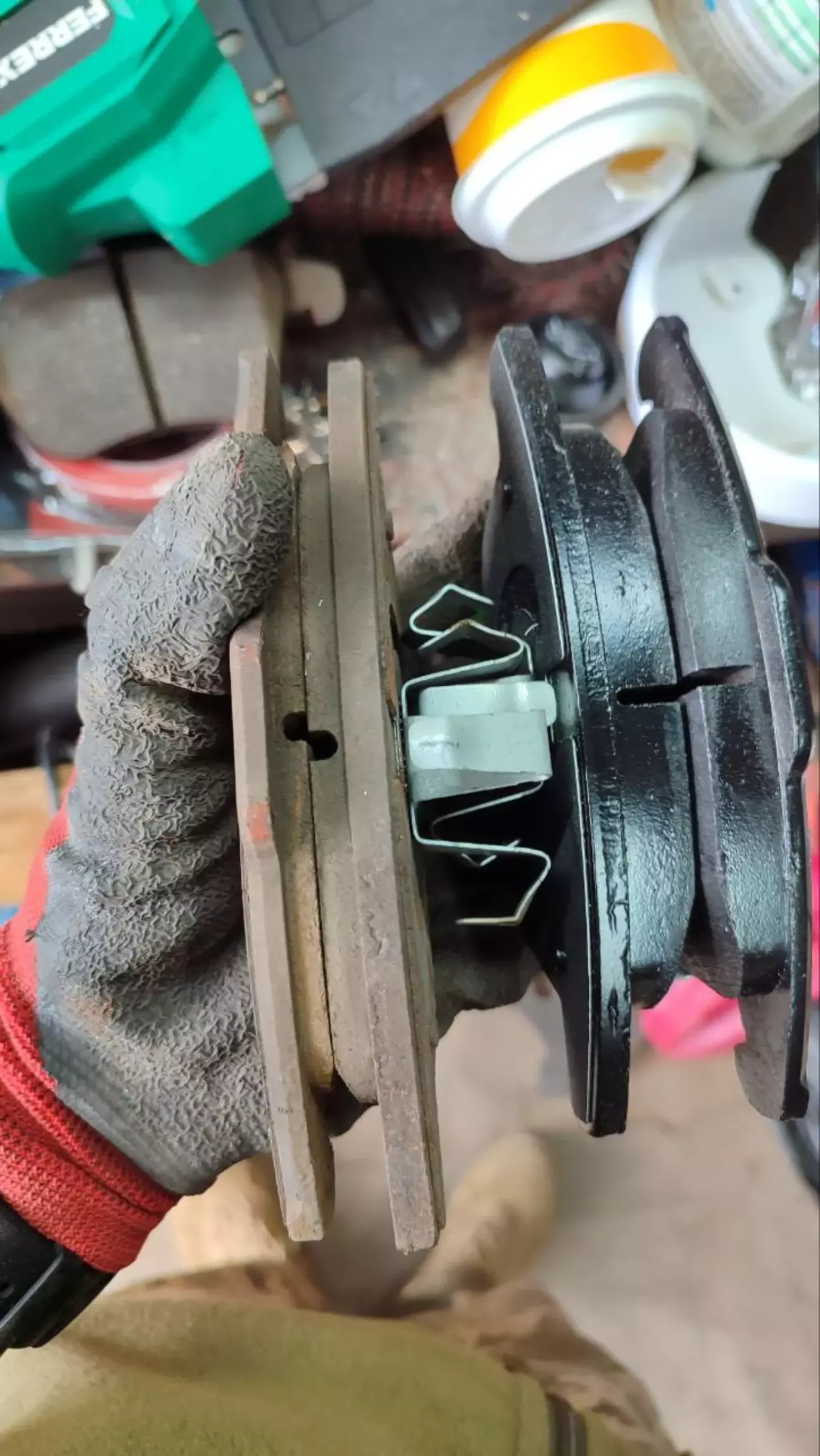 Знімаємо старі колодки, чистимо щіткою з очисником, і в моємо випадку на супорті лишився клей від старих колодо, попшикав очисником і наждачкою 1000 пройшовся, далі продув все повітрям.