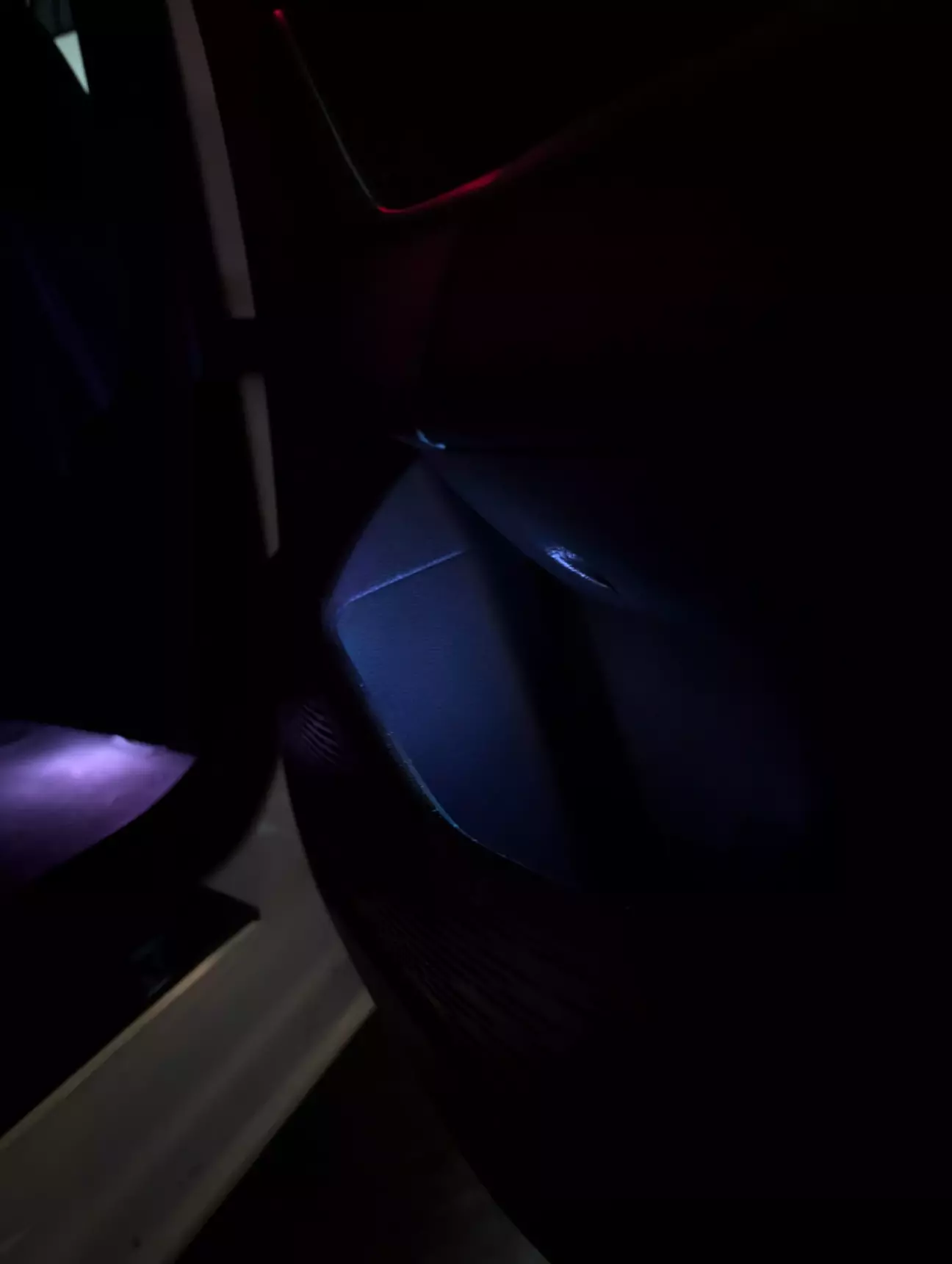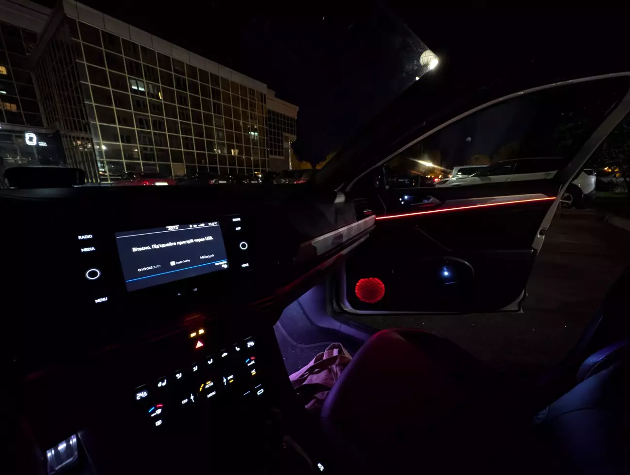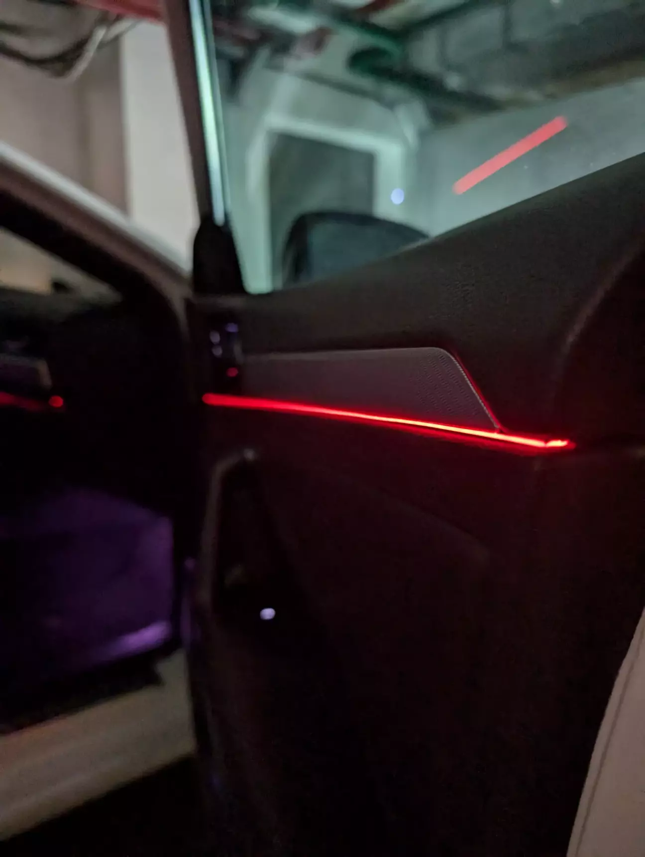 Підсвітка ніг стала паралельно з Footwell підсвіткою. Задум такий - при працюючому амбієнті можна залити простір в ногах якимось кольором, в той час як при посадці в машину, або при виході з неї - маємо звичайне біле світло в ногах не для атмосфери, а для зручності посадки і висадки
