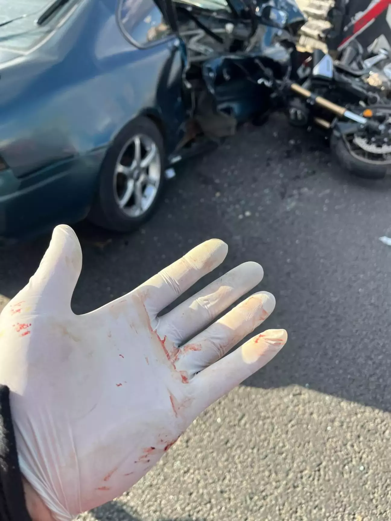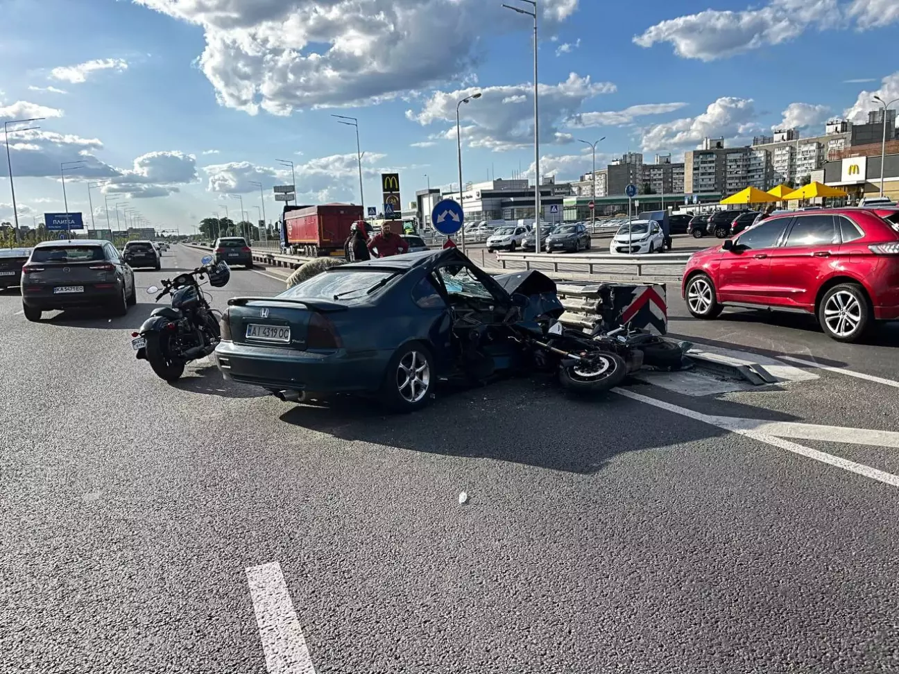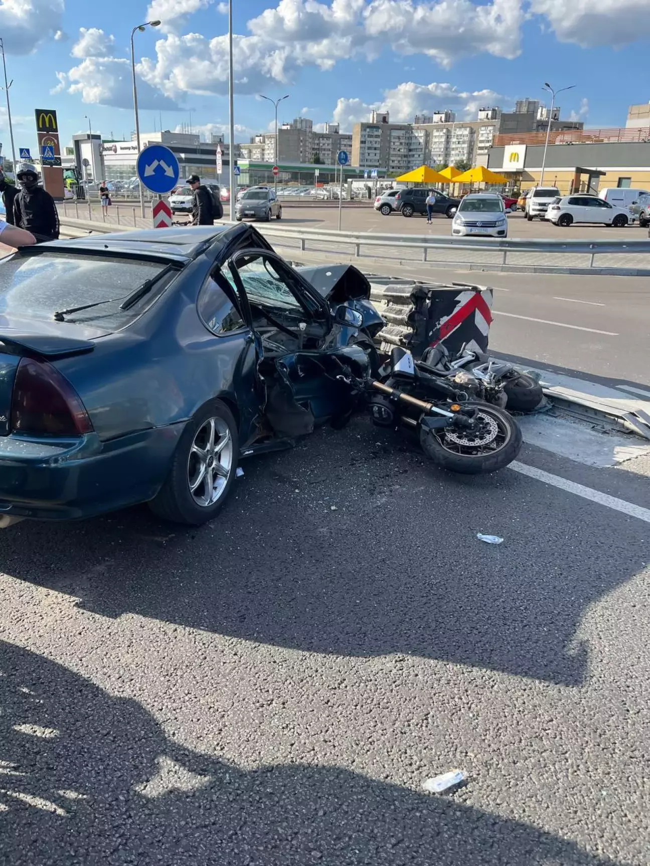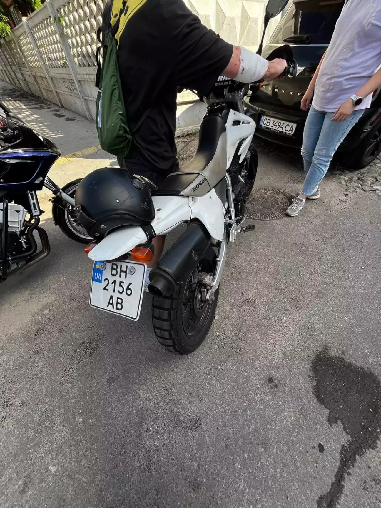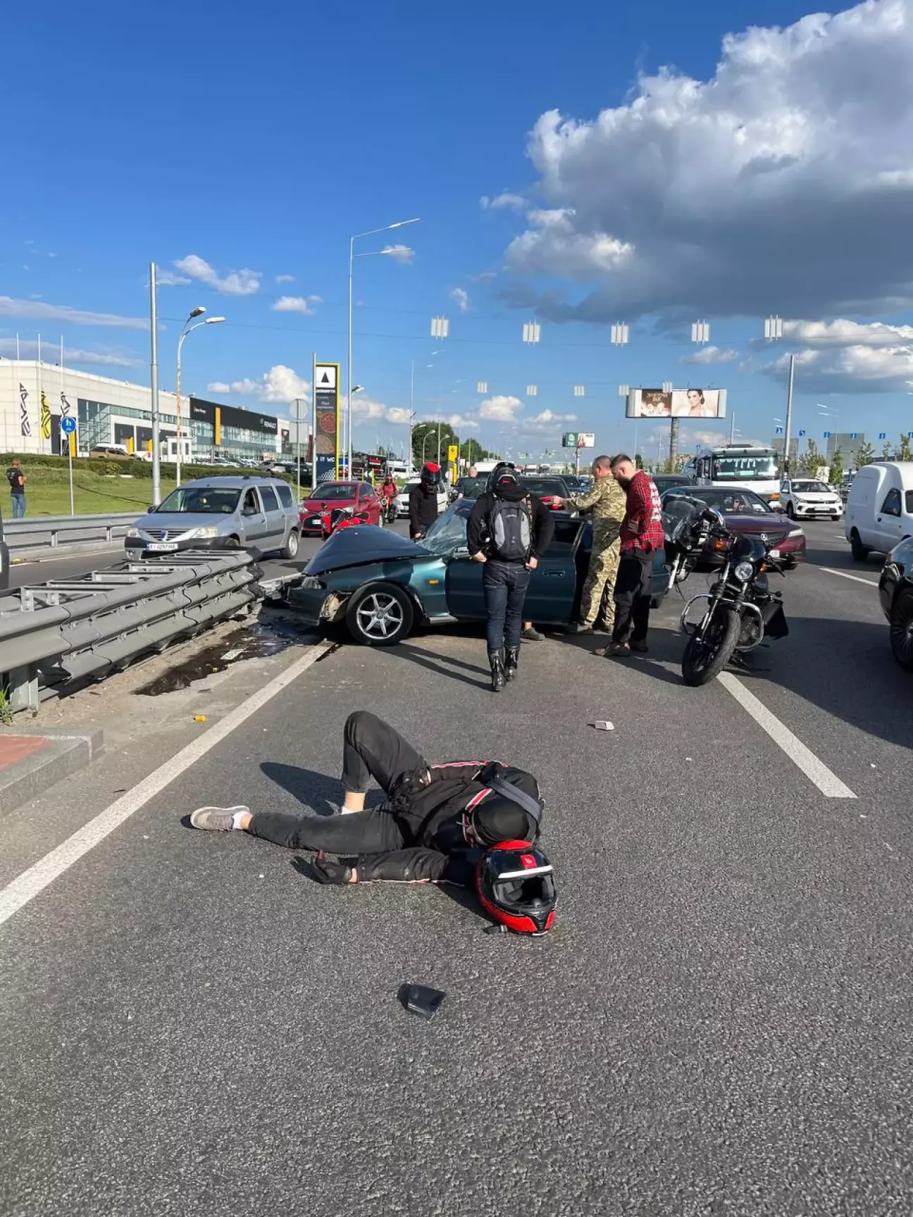Думав водій автівки десь вийшов, бо усі стояли тільки біля мотоцикліста.