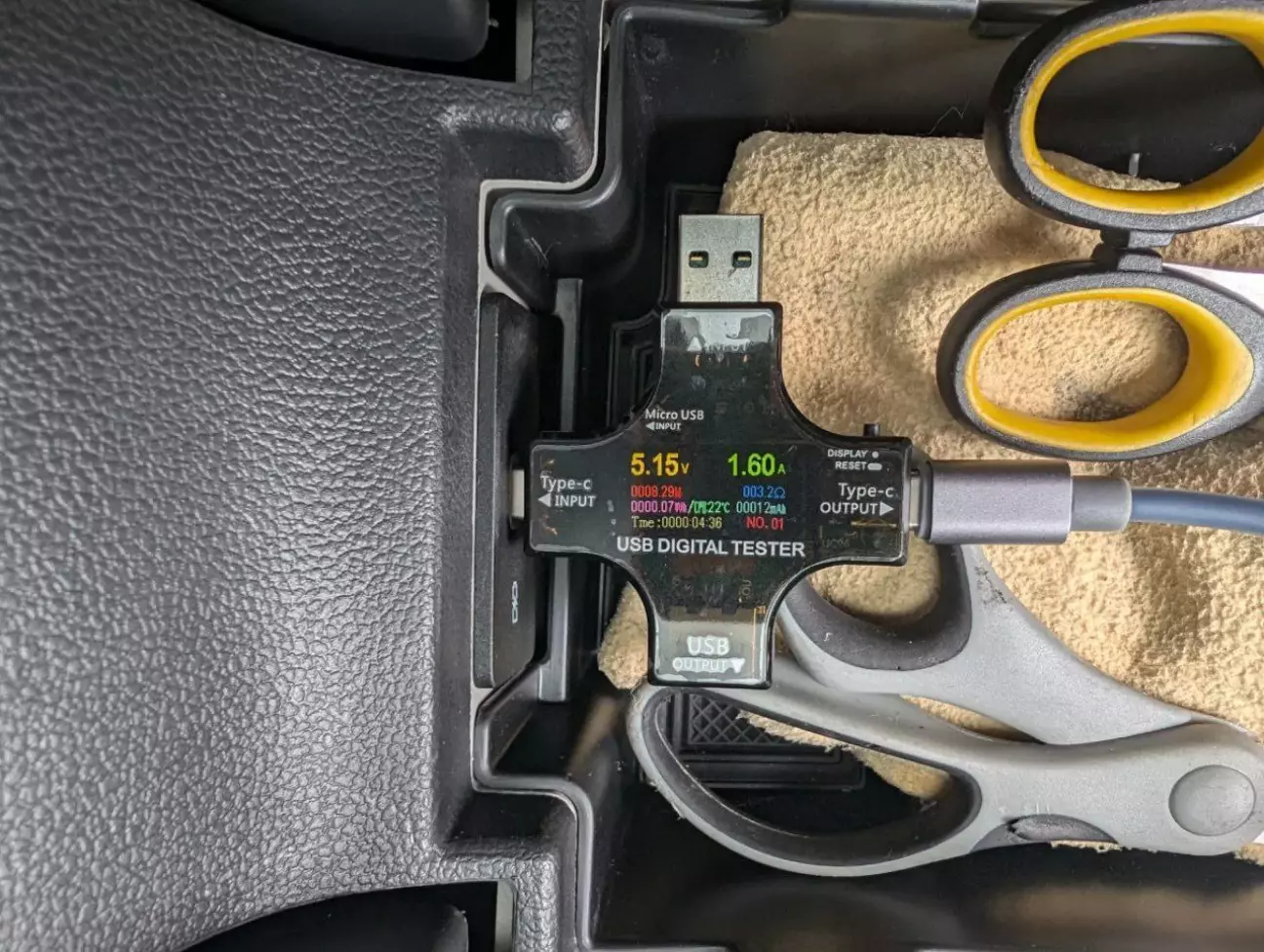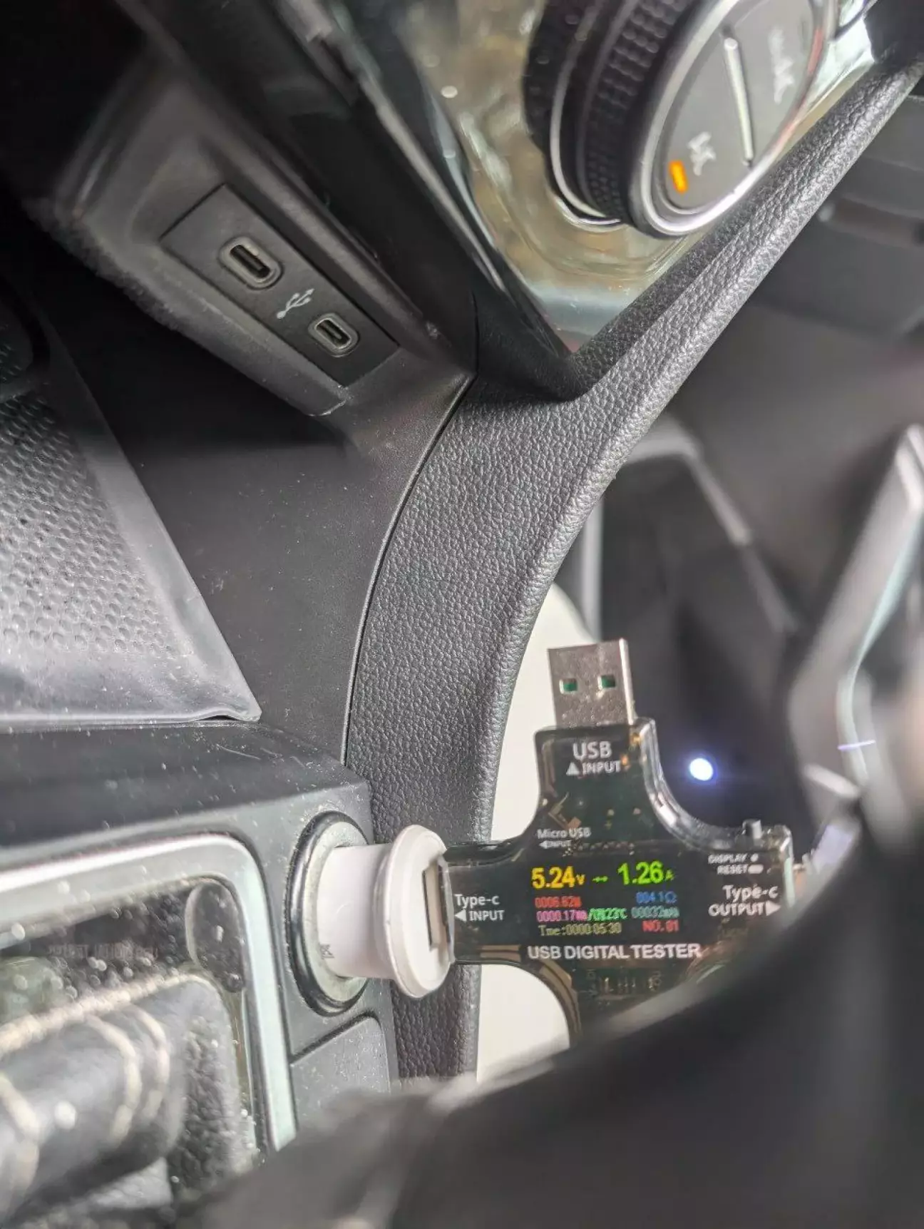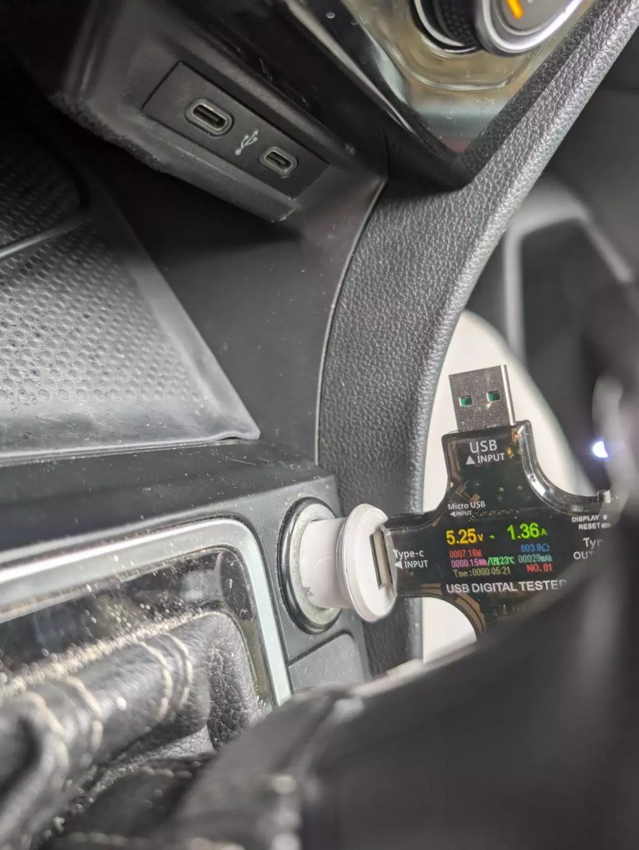 Слово за слово, заговорили з хлопцями про цей додатковий USB, почитав записи, бачу, що всі скаржаться на одну проблему - Type-C під блоком клімату (єдині USB порти в машині, по суті) - не заряджають нормально телефон. Вірніше от взагалі не заряджають. @ivmulder заміряв тестером потужність на виході - і отримав аж цілих 2,16 Вт. В той час як у підлокітнику (читайте - у прикурювачі, бо проводка бере живлення саме там) - 9 Вт. Проте в нього USB Type-A