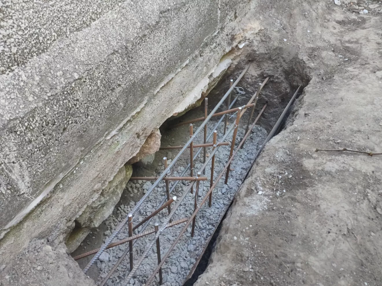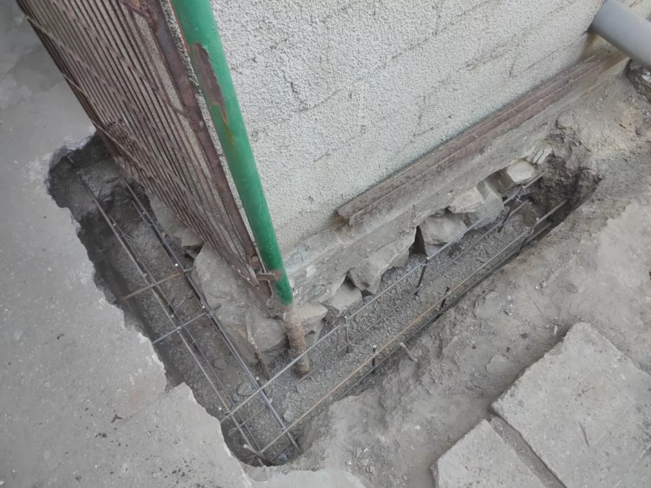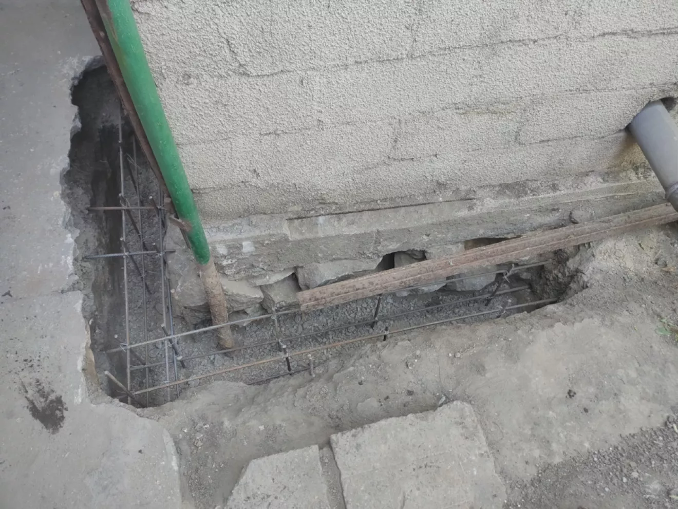 Так как фундамент гаража проседал было принято решение укрепить фундамент путем подрытия и подливки бетона марки М300 под фундамент.