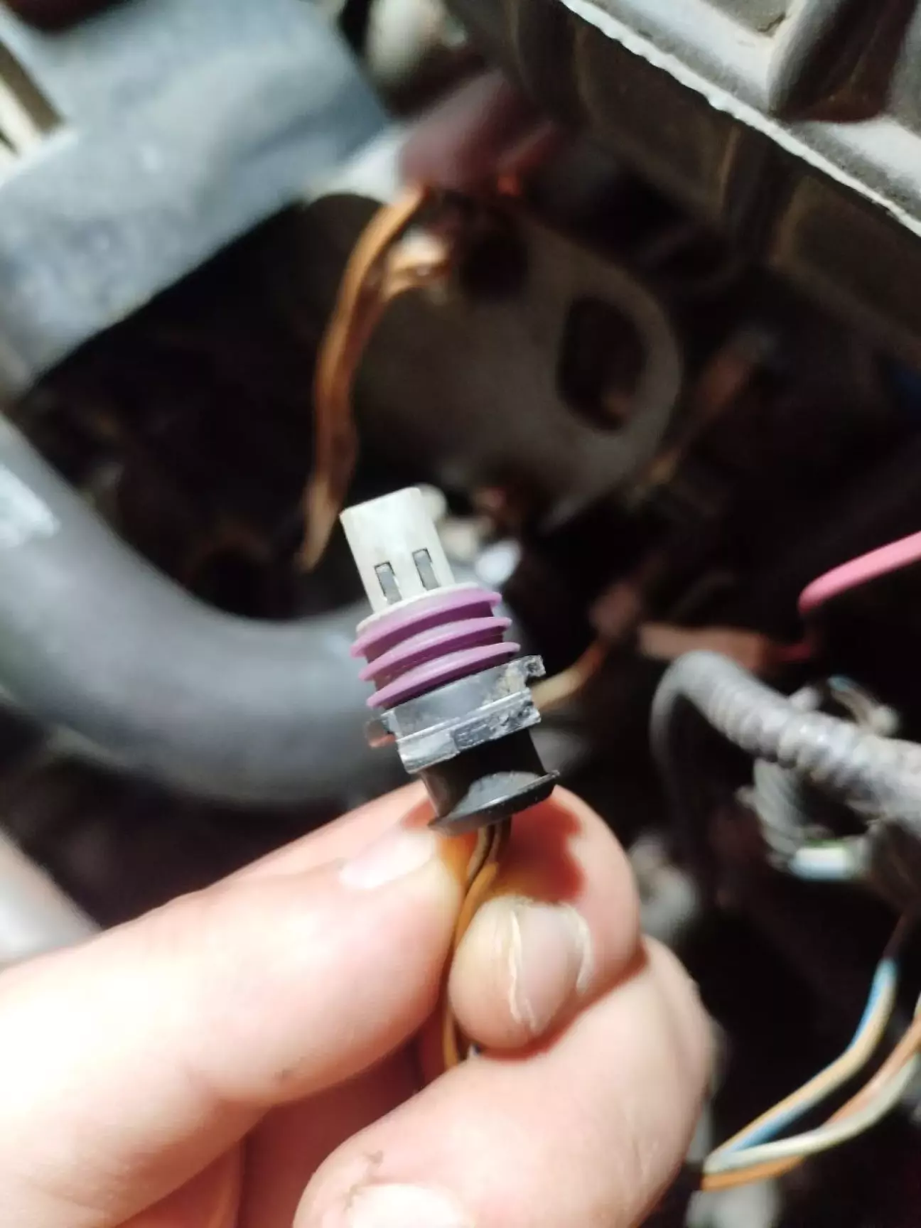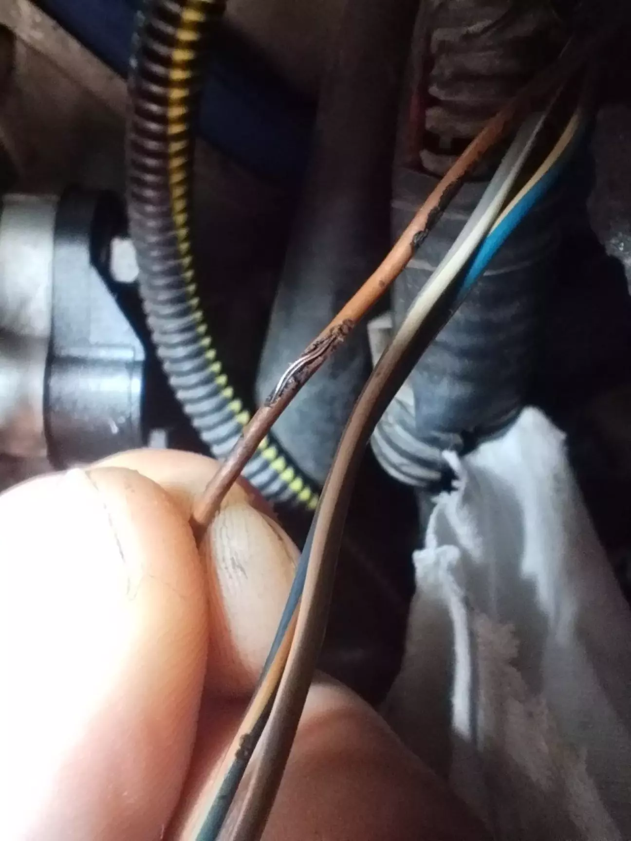 Не обійшлося і без ДПДЗ. Хочу розповісти вам і показати, в якому стані були дроти, точніше, що з ними сталося за роки експлуатації автомобіля. Як видно на фото, дроти перетерті. На секунду я подумав, що, можливо, вся ця проблема не в самих датчиках, а в тому, що оголені жили проводів ДПДЗ стикалися між собою під час їзди, викликаючи збої, коротке замикання і не даючи ЕБУ коректно зчитувати показники датчиків.