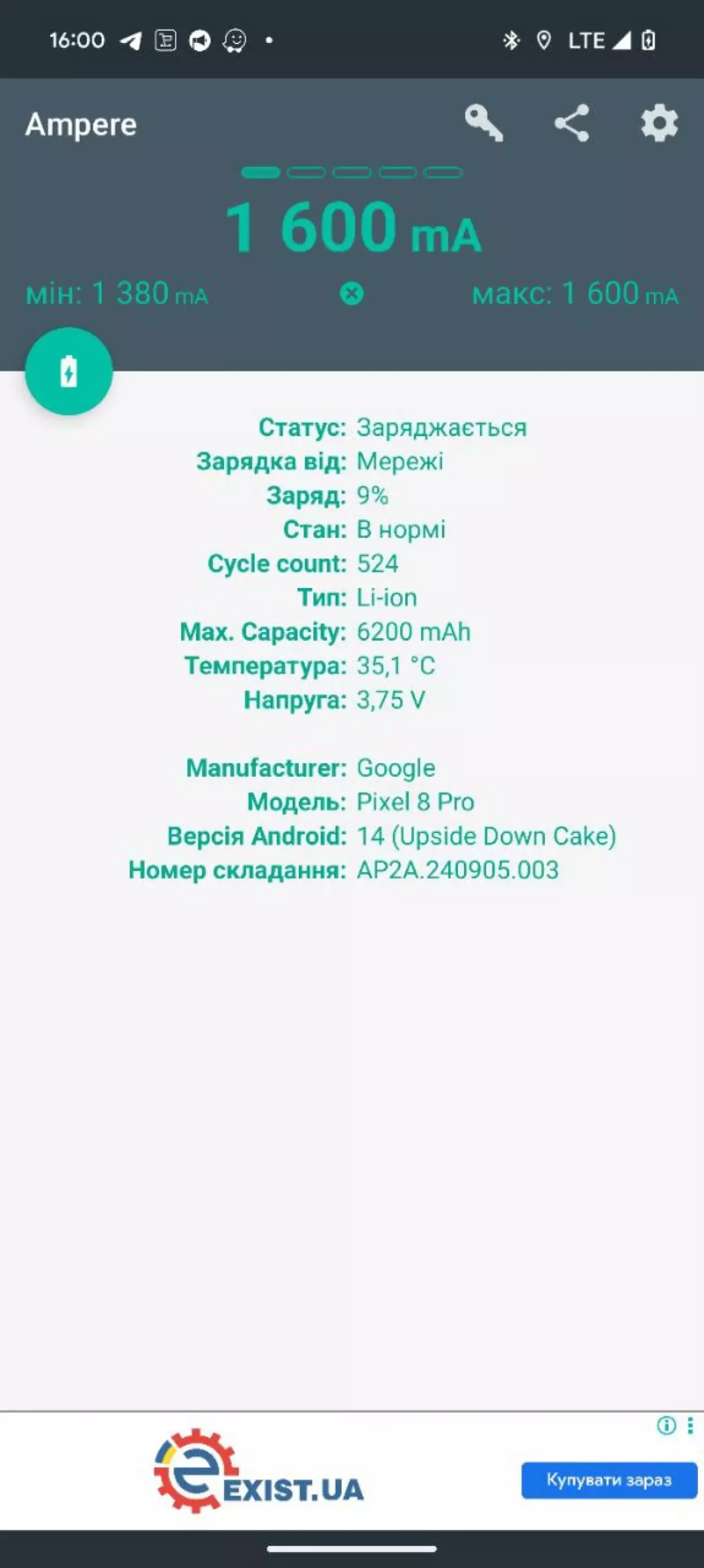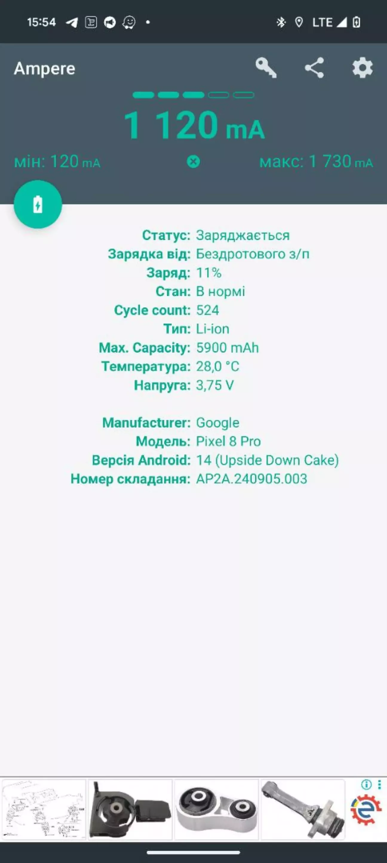 Тут ми можемо вже говорити про чесні 15 Вт, які переварює телефон (нагадую, в усіх замірах використовується Google Pixel 8 Pro, апарат сам по собі досить вимогливий до зарядних пристроїв і просто плюне вам попередженням в лице, якщо ви сунете в нього китайський шнурок за 50 гривень увімкнутий в блочок котрий дістався ще в спадок від бабусі з Nokia. А якщо ви це попередження проігноруєте, то на зарядці у вас телефон просто буде повільно розряджатись)