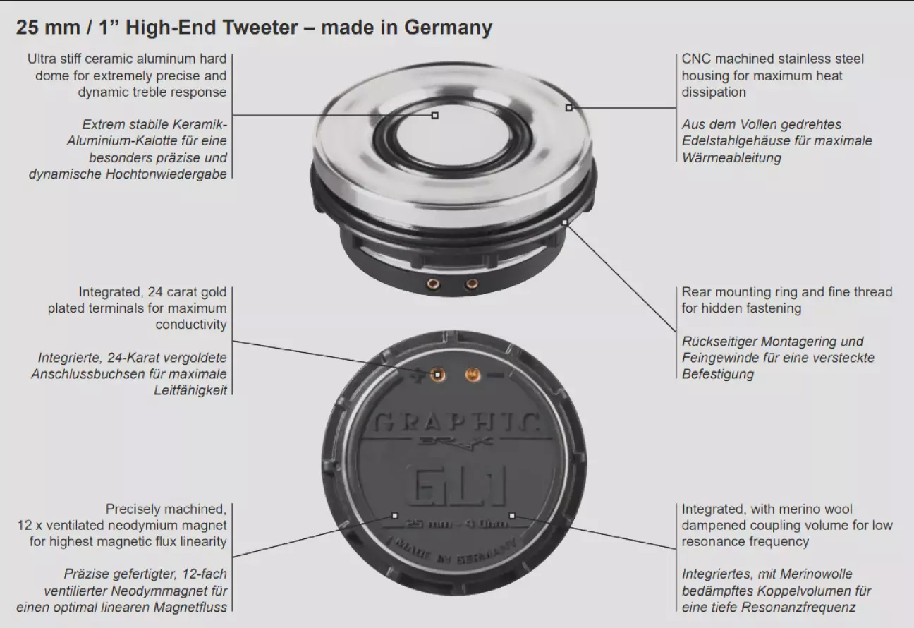 Купол твітера спирається на м’який шовковий підвіс і виготовлений з алюмінію, поверхня якого додатково оброблена керамічно.