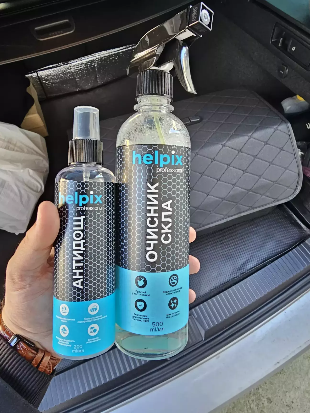 Спочатку вимив вікна та витер сухою мікрофіброю (очисних скла Helpix). Потім по інструкції наніс антидощ та розтер по склу, через 45 секунд почав розтирати підсохшу речовину. Видно, що скло чимось покрито.
