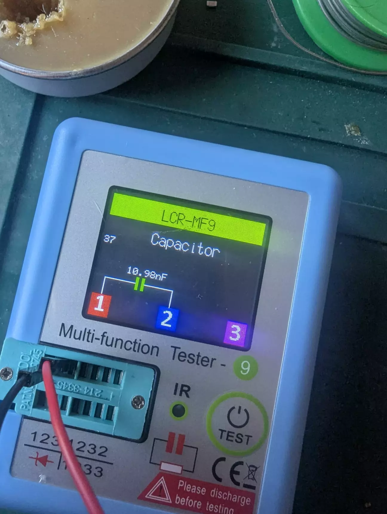 Я допаяв біля транзисторів ще конденсатори з китайської торби на фото видно номінал на тестері