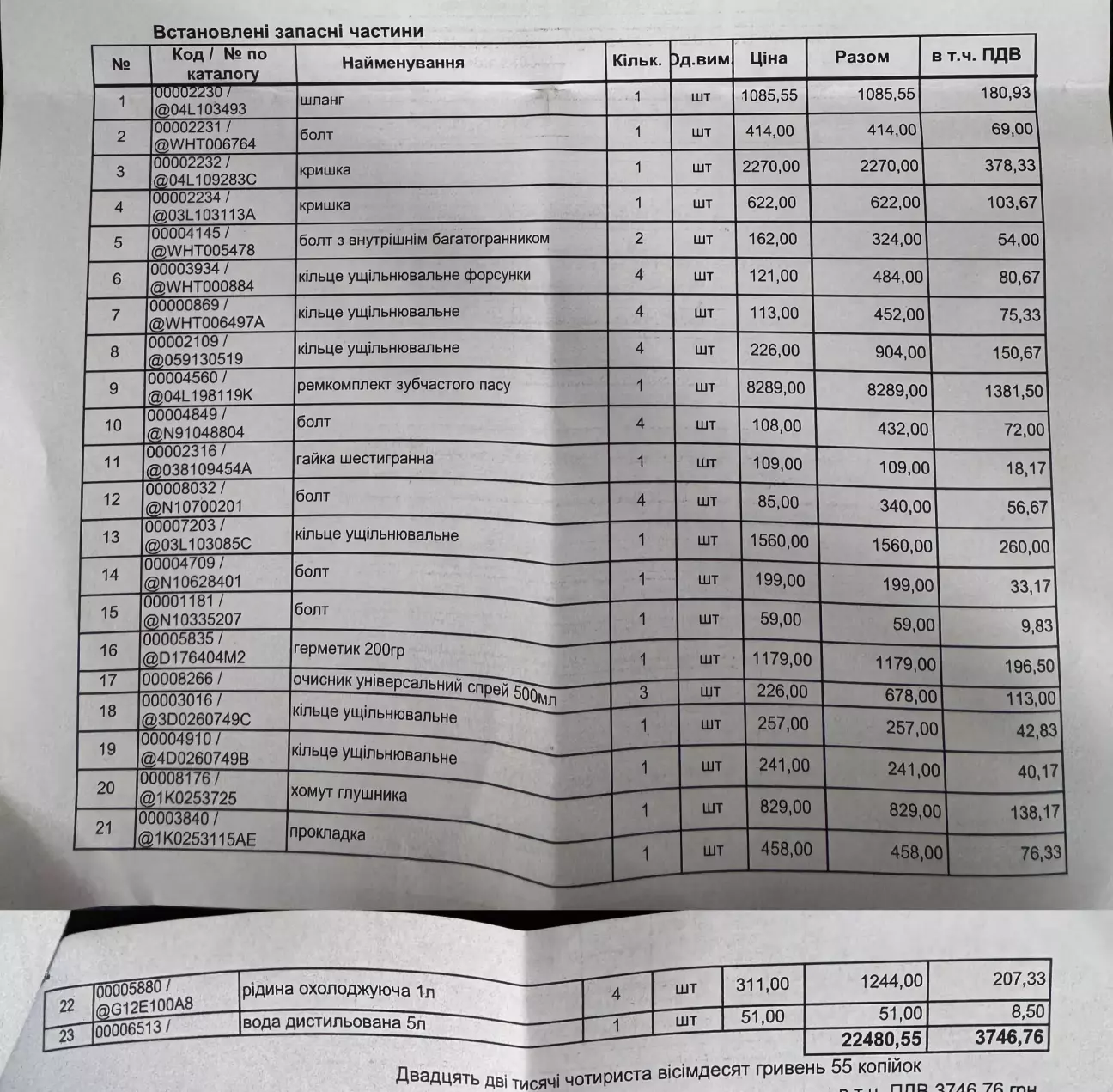 ГРМ, постіль, запчастини 24480 + скажем робота була 20 тис.