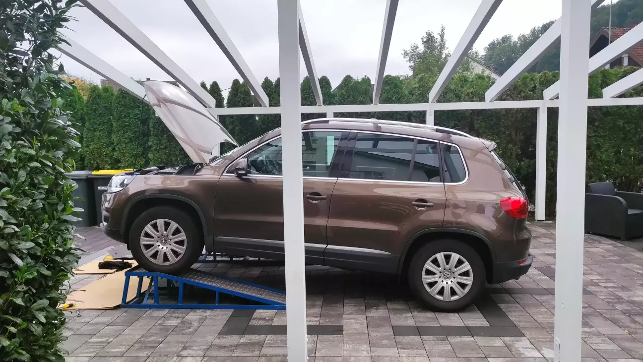Для зручності маніпулювання з захистом та зливною пробкою Тігуан передом заїхав на мою мобільну рампу.