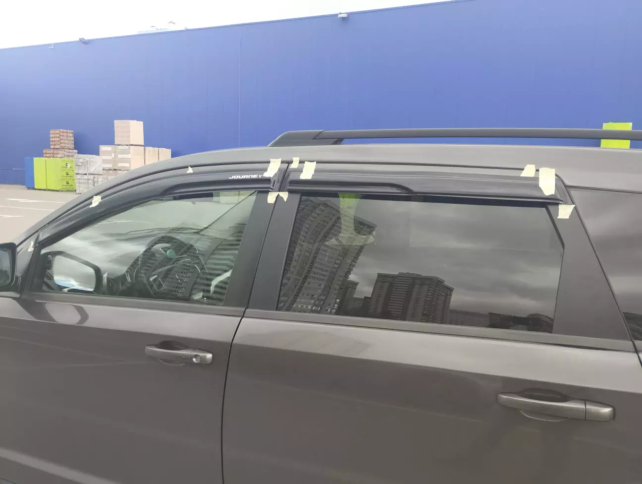 Отдираю скотч с ветровиков. Он отваливается прям очень легко, местами прям просто тянеш его и он вжух и отошёл без особых прилипаний. Обезжириваю и клею новый скотч. Ветровики на машине примеряю , крепя малярным скотчем, и выставляю оптимальное сочетание переднего и заднего, чтоб и какая то горизонталь была и соосность. Начинать лучше с заднего, ибо у него по сути только одно положение для поклейки будет оптимальным , а уже от стыковки с ним выставляем передний.