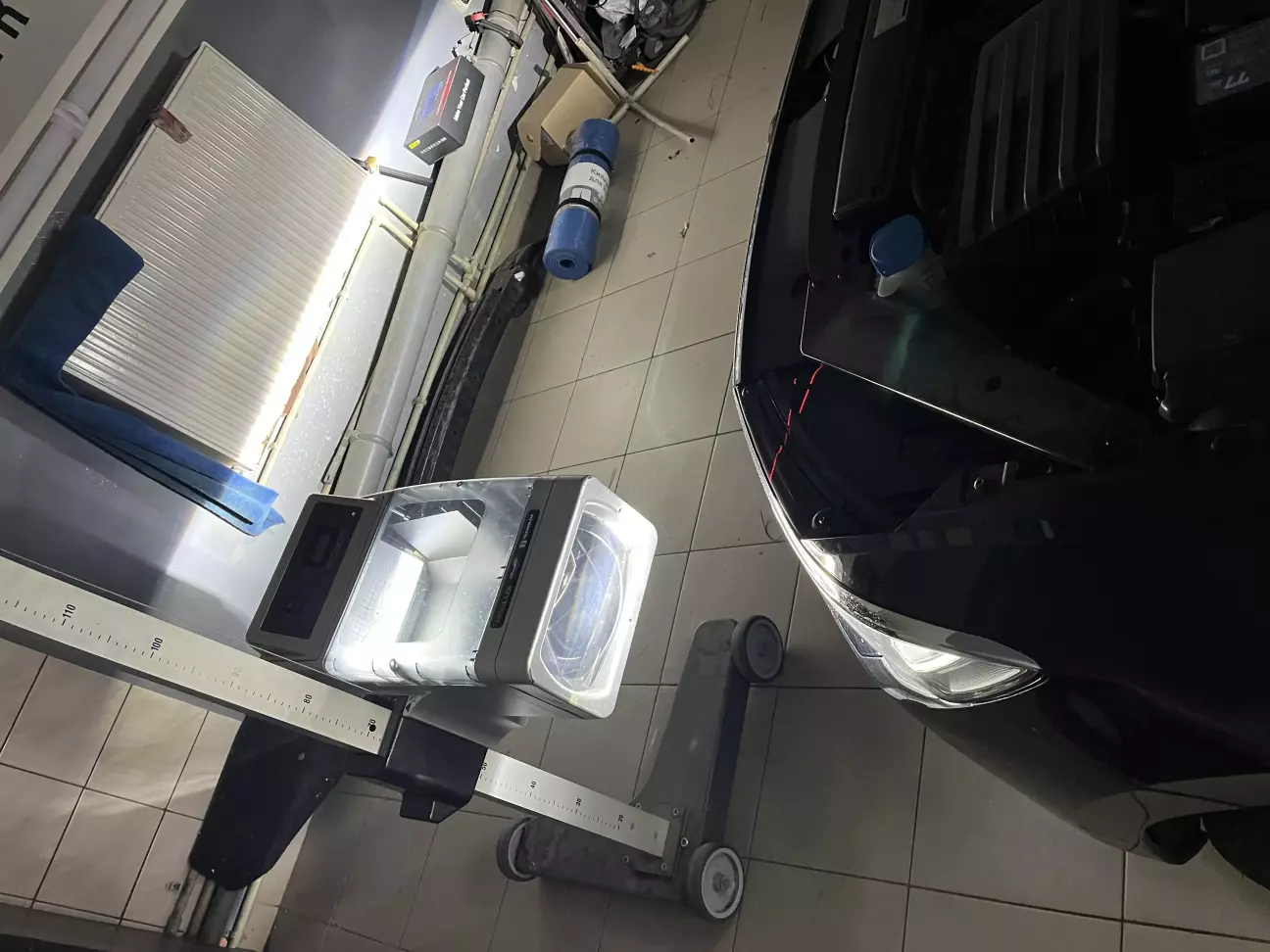 Осуществил регулировку ближнего света фар, как показывает практика у многих ближний свет фар существенно занижен с завода, для регулировки сначала нужно выставить модуль ближнего и дальньнего света в одну ось для этого нам нужна головка на 6 и удлинитель снимаете крышечку с фары и выравниваете его в один горизонт с ближним светом фар и это делается на включеном ближнем свете фар. Потом на стенд и уже выставляете сам ближний свет, у меня я хочу сказать очень сильно был занижен свет.