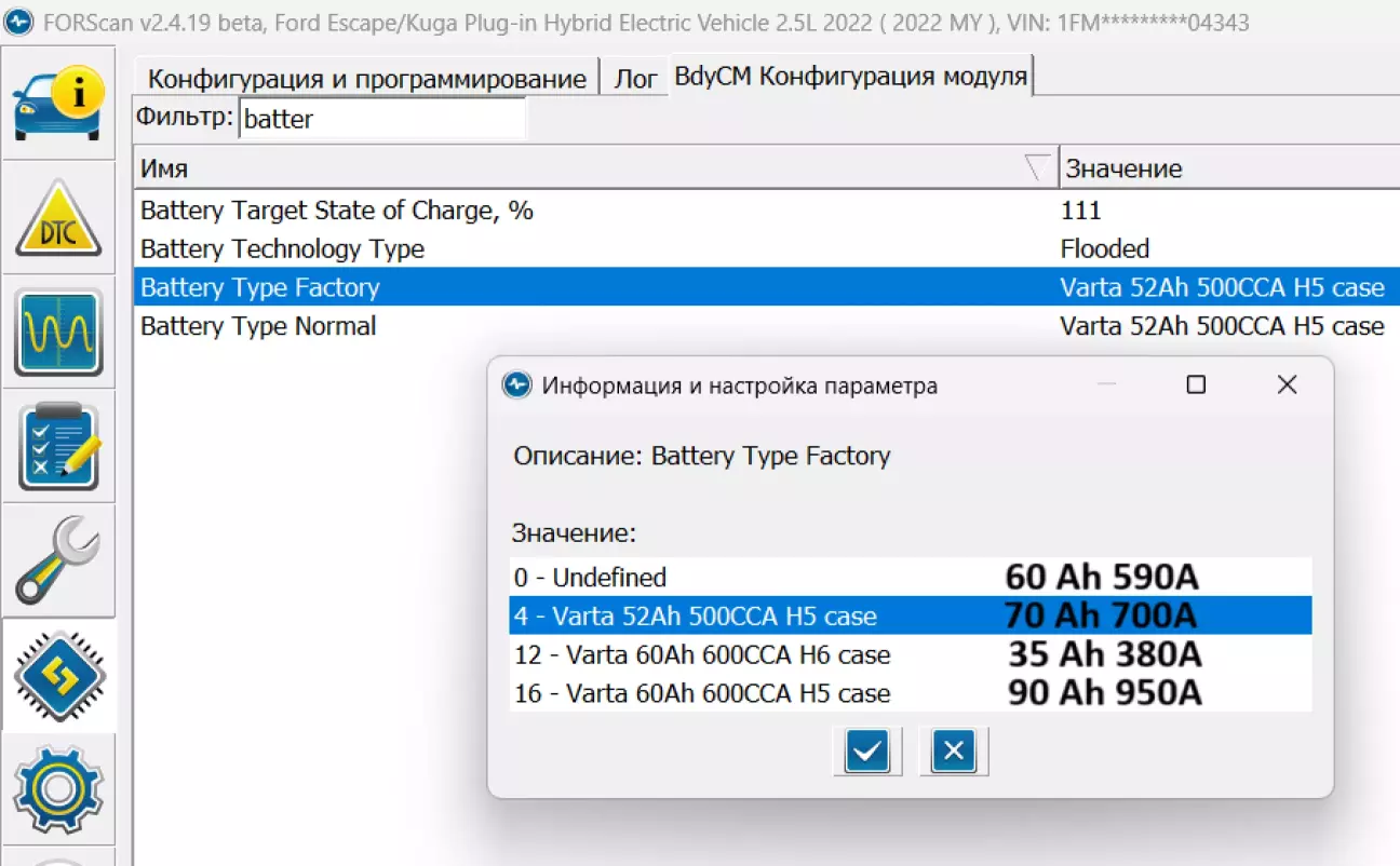 Forscan пропонує на вибір кілька типів АКБ. Однак є цікавий нюанс: якщо обрати, наприклад, варіант «Varta 60Ah H6» і зберегти налаштування, він одразу відобразиться в потоці даних. Проте значення в окремому полі «Ємність» може відрізнятися від зазначеного в назві.