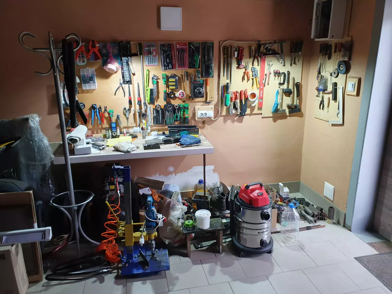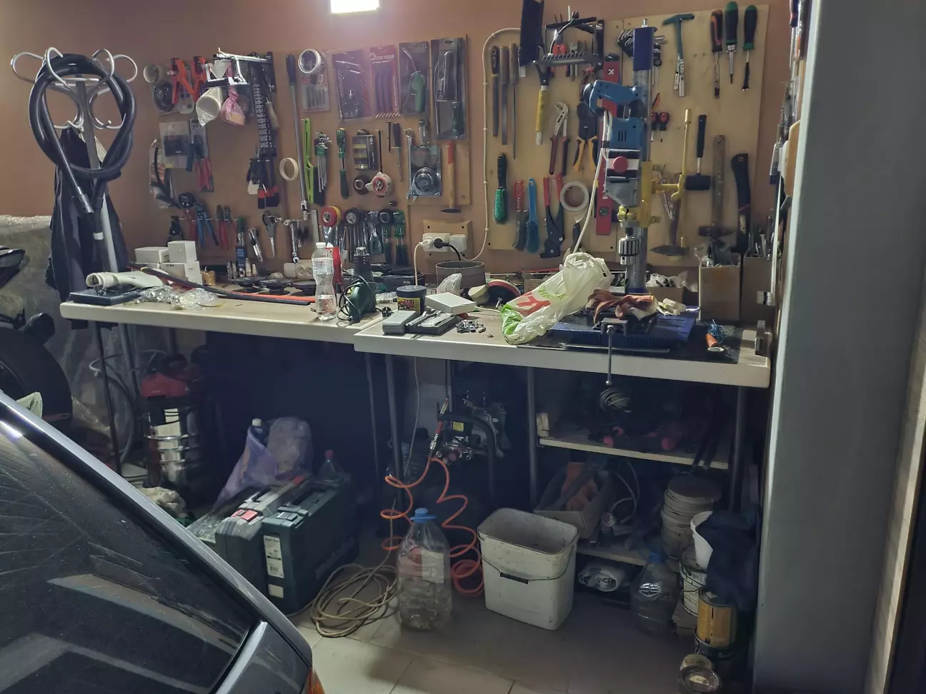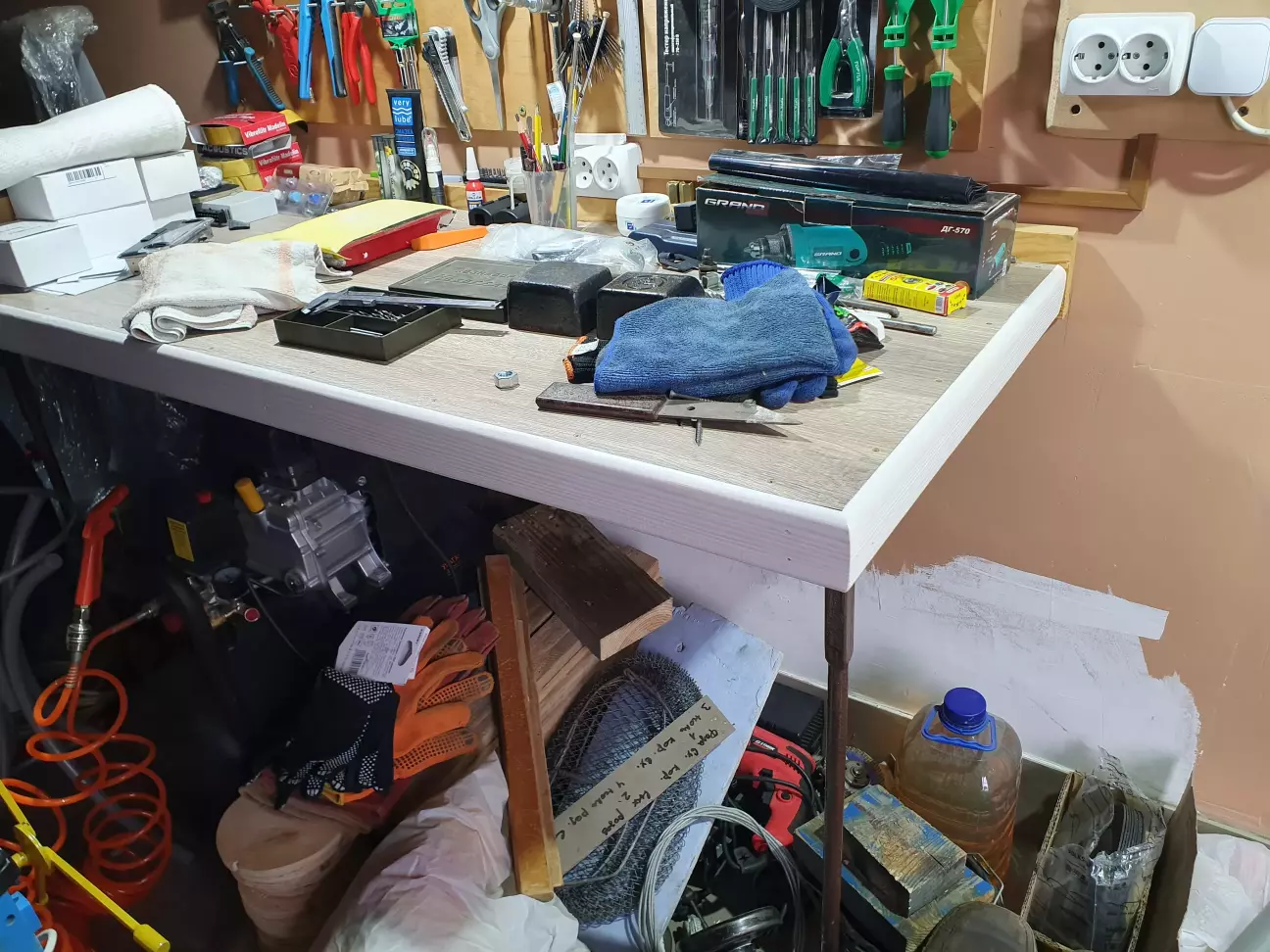 Старий стіл був порізаний на донора. Свердлильний верстат батя зробив зі старої потужної дрелі для своїх потреб. Тепер робочий простір виглядає охайніше, але бардак на цих столах буде скільки не прибирай) Але я стараюсь)