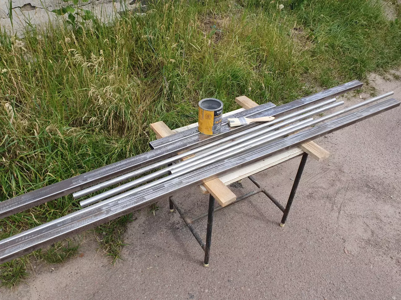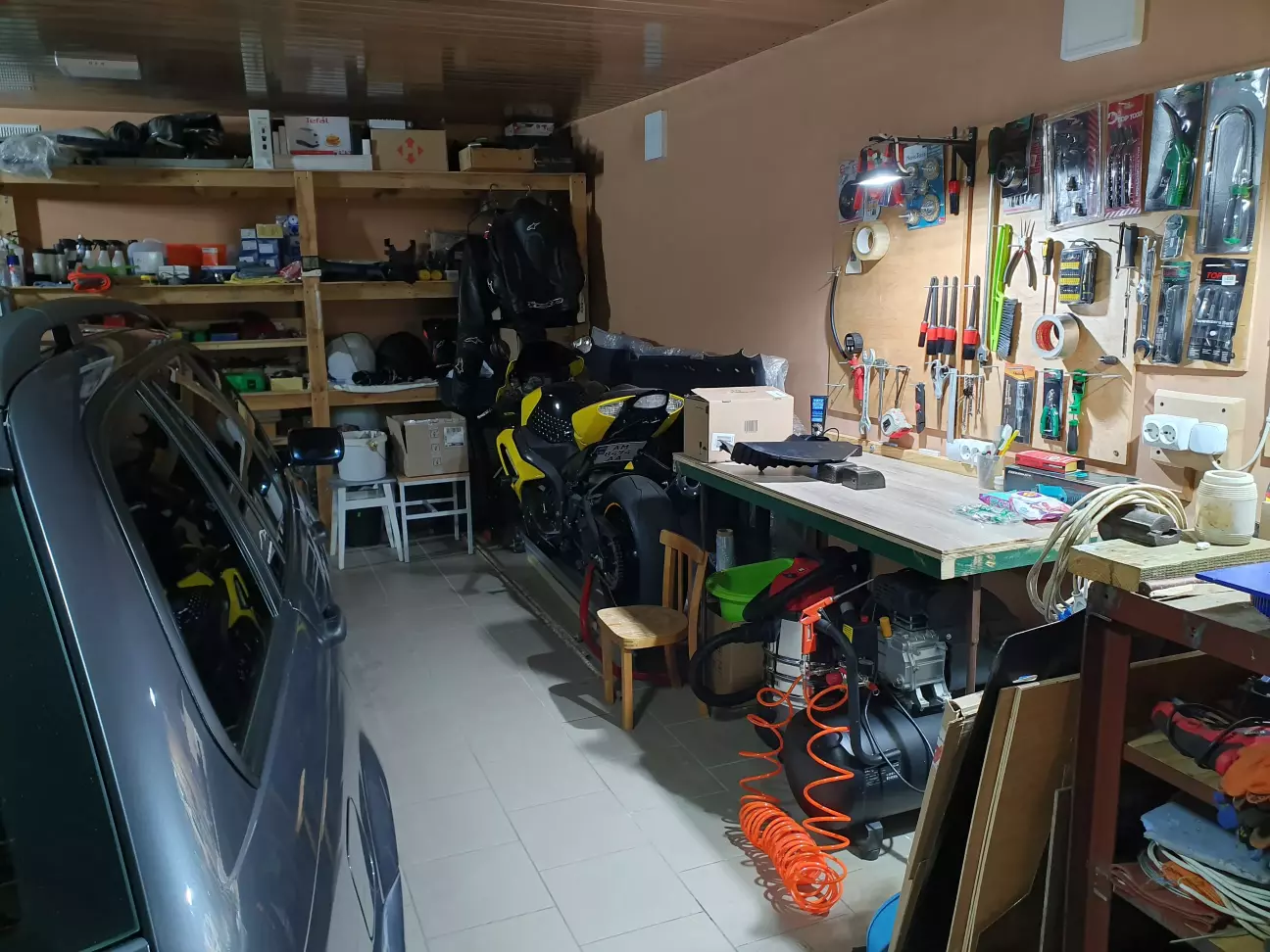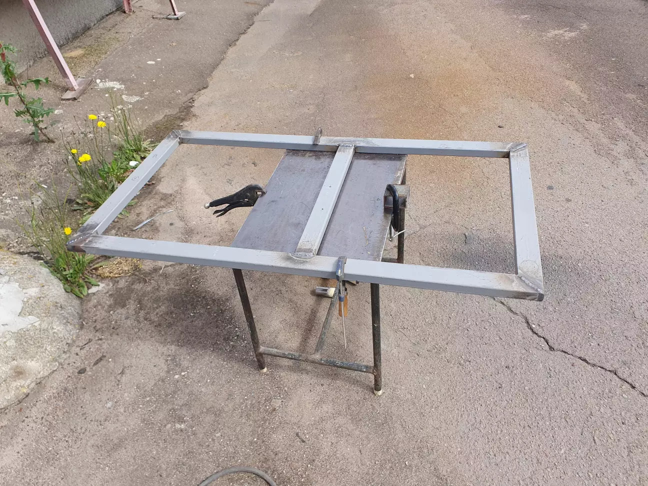 Як ви можете пам'ятати, я з батєй робив складний стіл, який тепер використовується як стаціонарний, так зручно з ним) Тепер прийшов час переробити старий, який дістався від попереднього власника. Вирішили робити такої ж висоти як перший, максимально близько до нього, але трошки ширше, щоб з під нього не стирчав компресор. Для нього зробимо окрему зону, щоб він стояв завжди на своєму місці і 2 полиці для електроінструменту і всіляких дрібниць.