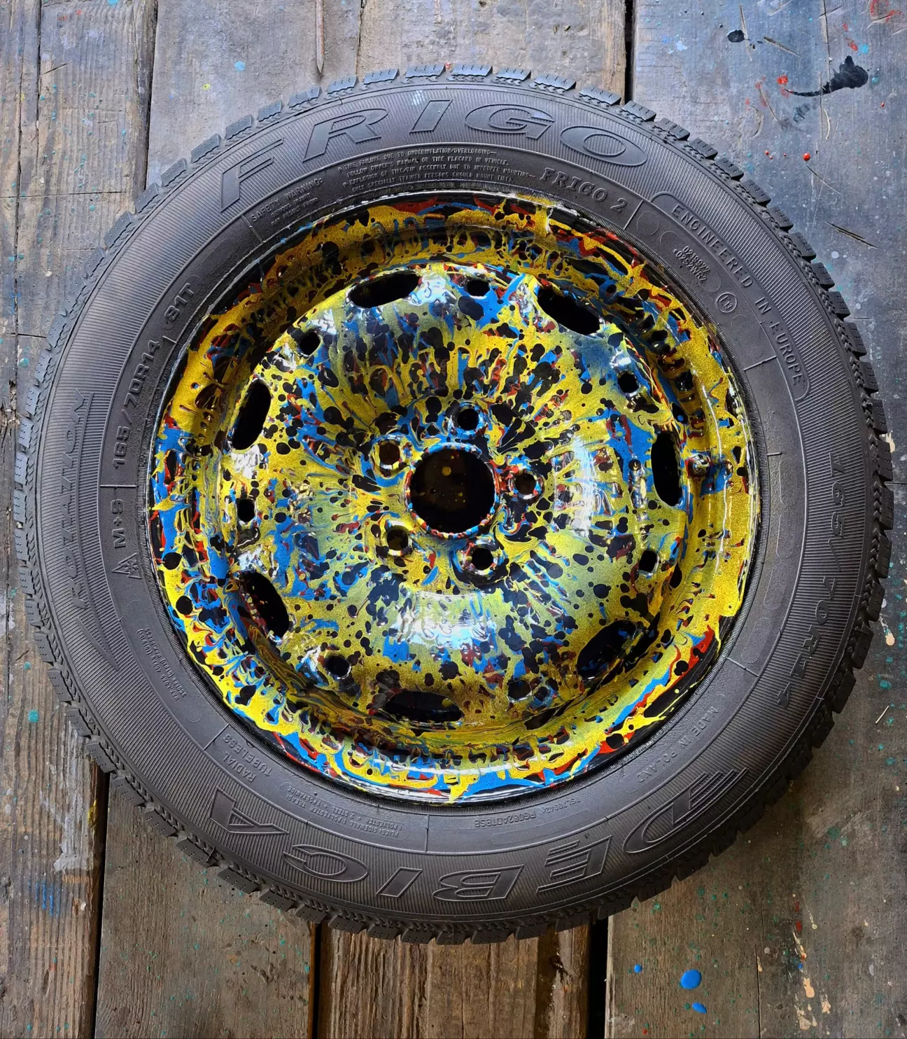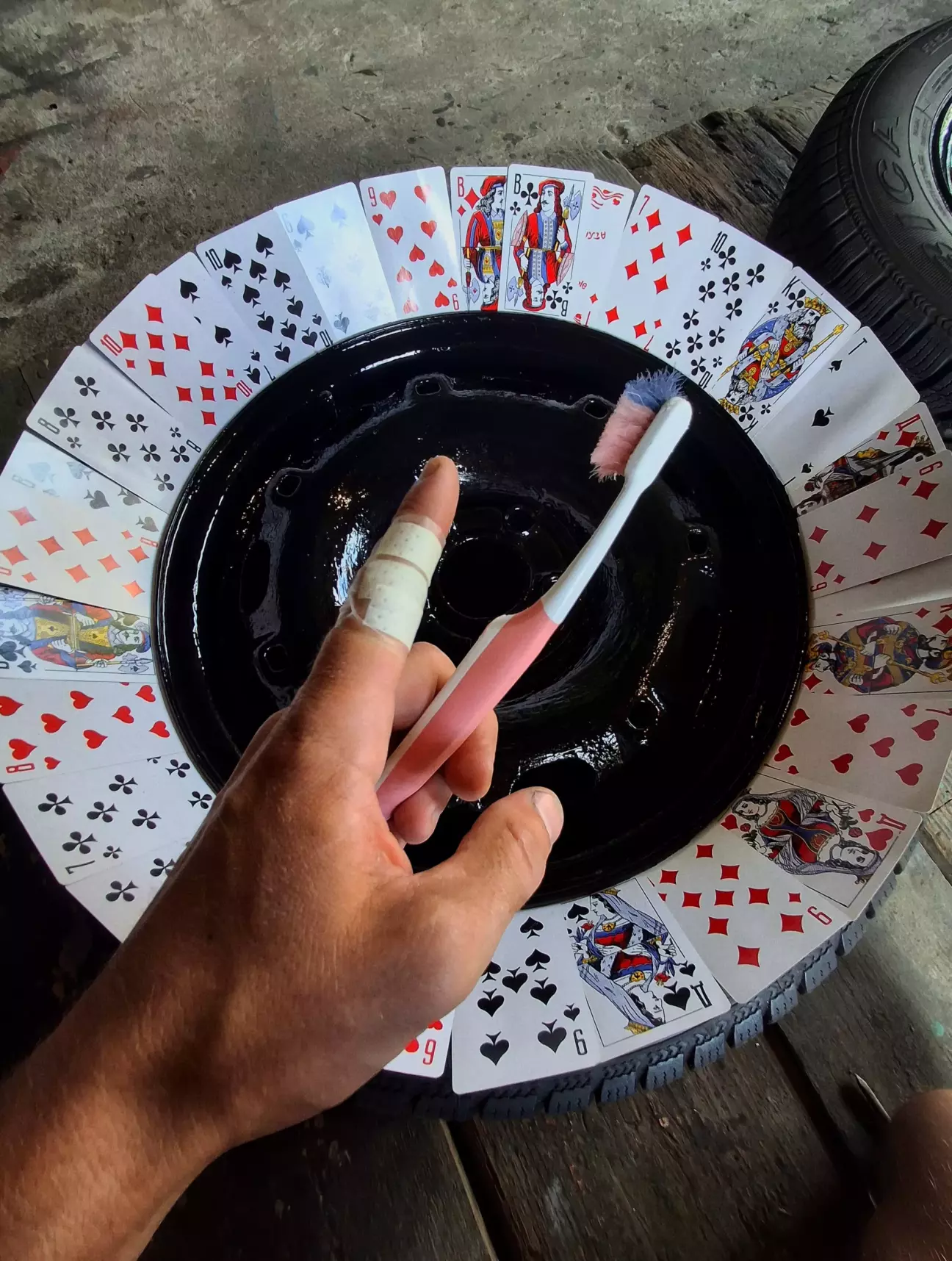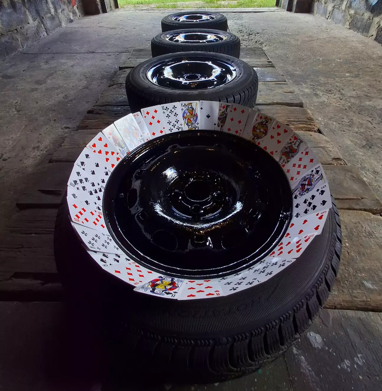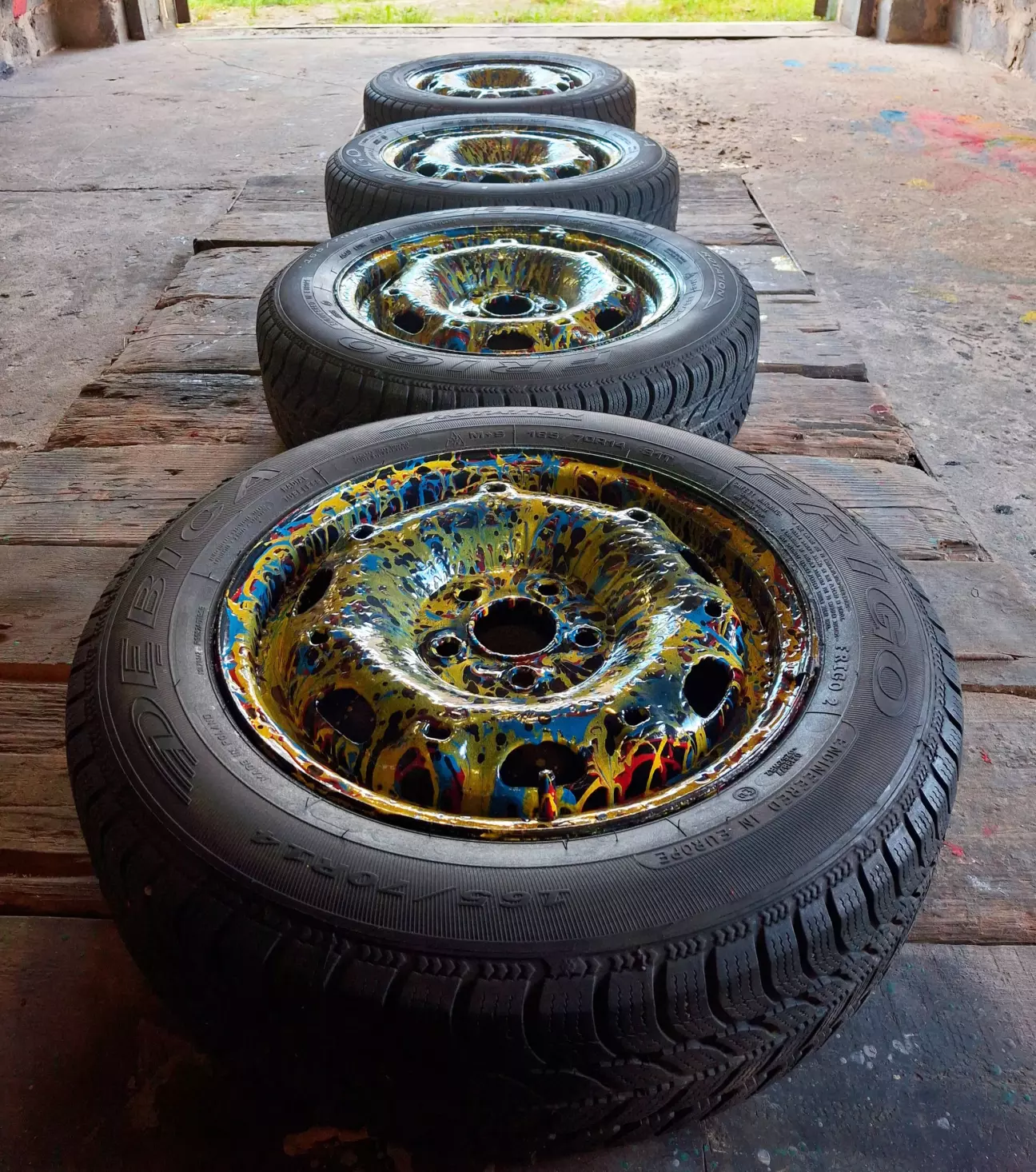 По роботі : Почухав всі чотири диски дрелью з насадкою " щіткою " далі пофарбував повністю чорною корабельною фарбою, дав підсохнути.
