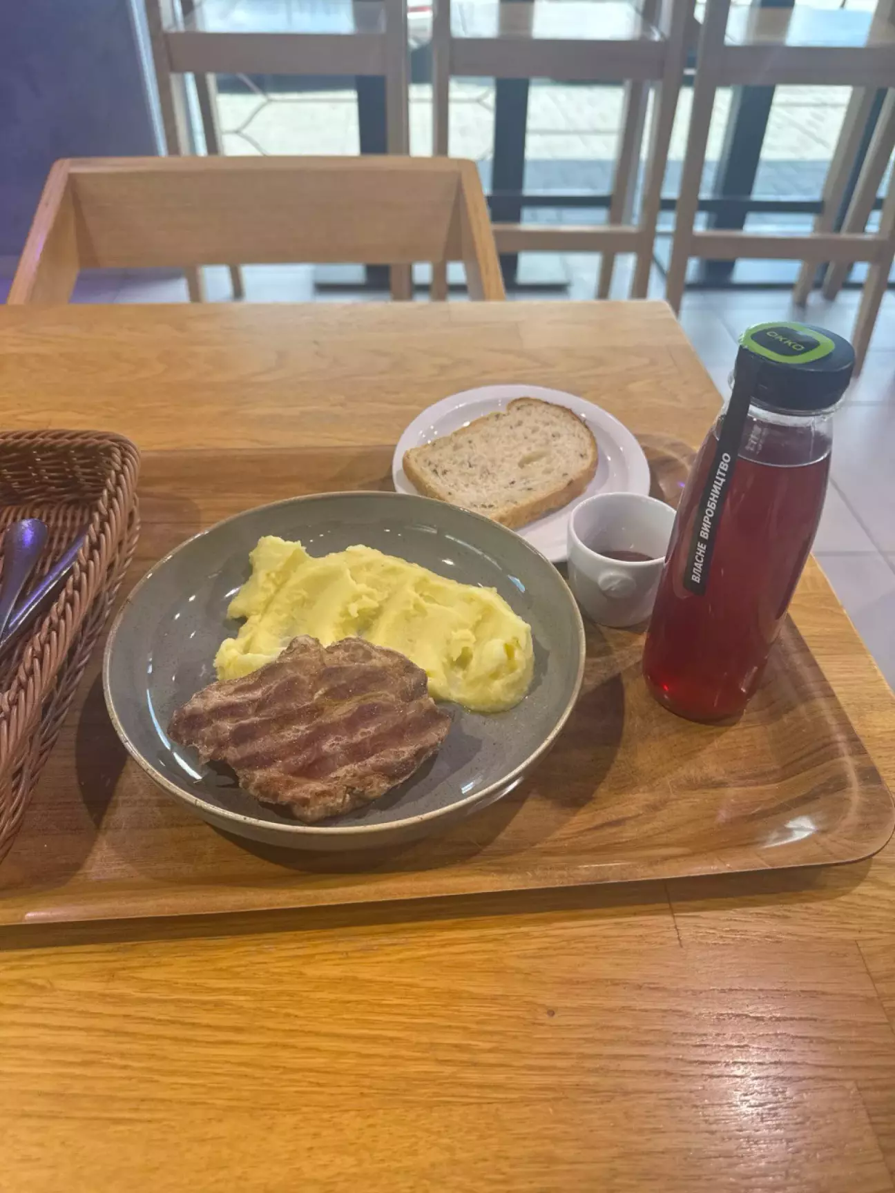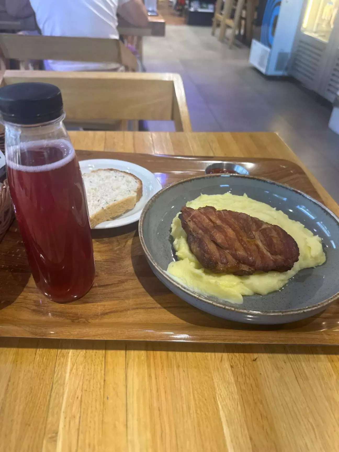 Я дуже перебірливий в плані їжі, тому коли не маю часу і ресурсу на експерименти, беру перевірений варіант. ОККО, пюрешка і стейк зі свинини + їній полуничний компот.