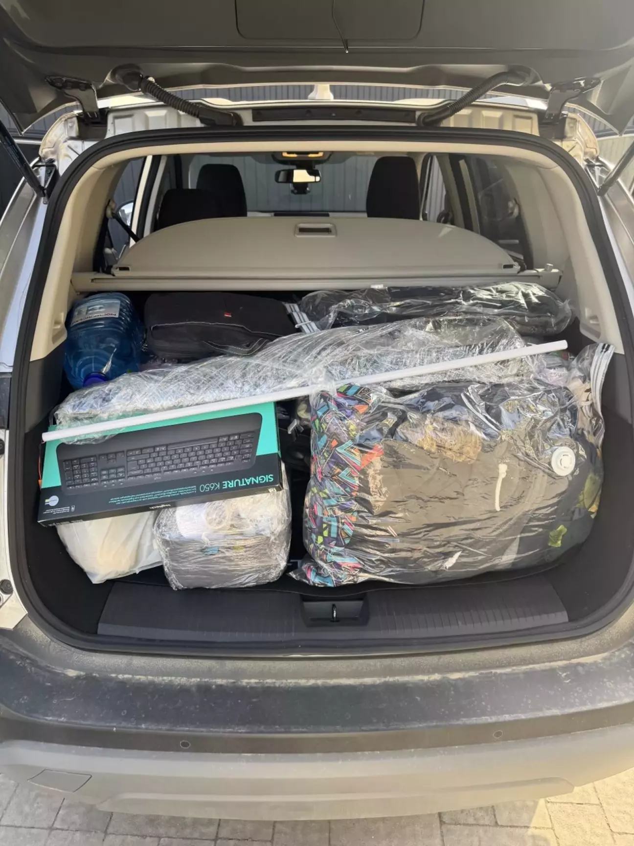 Значить частина речей на складі, частина їде доставкою, велика частина пішла на гуманітарку і ще частина була просто викинута, ну і мікроавтобус Маршрутка теж привезла багато чого.