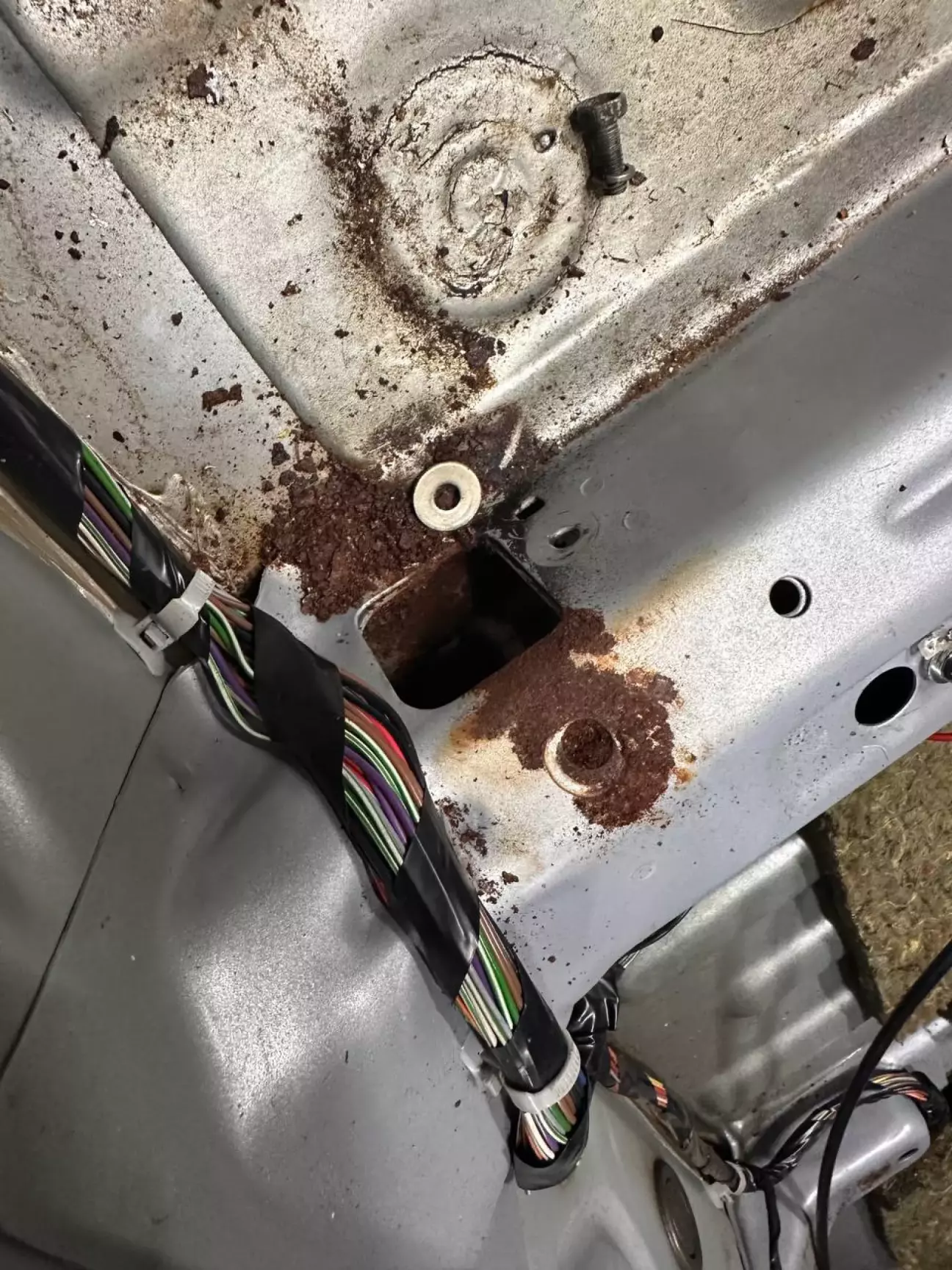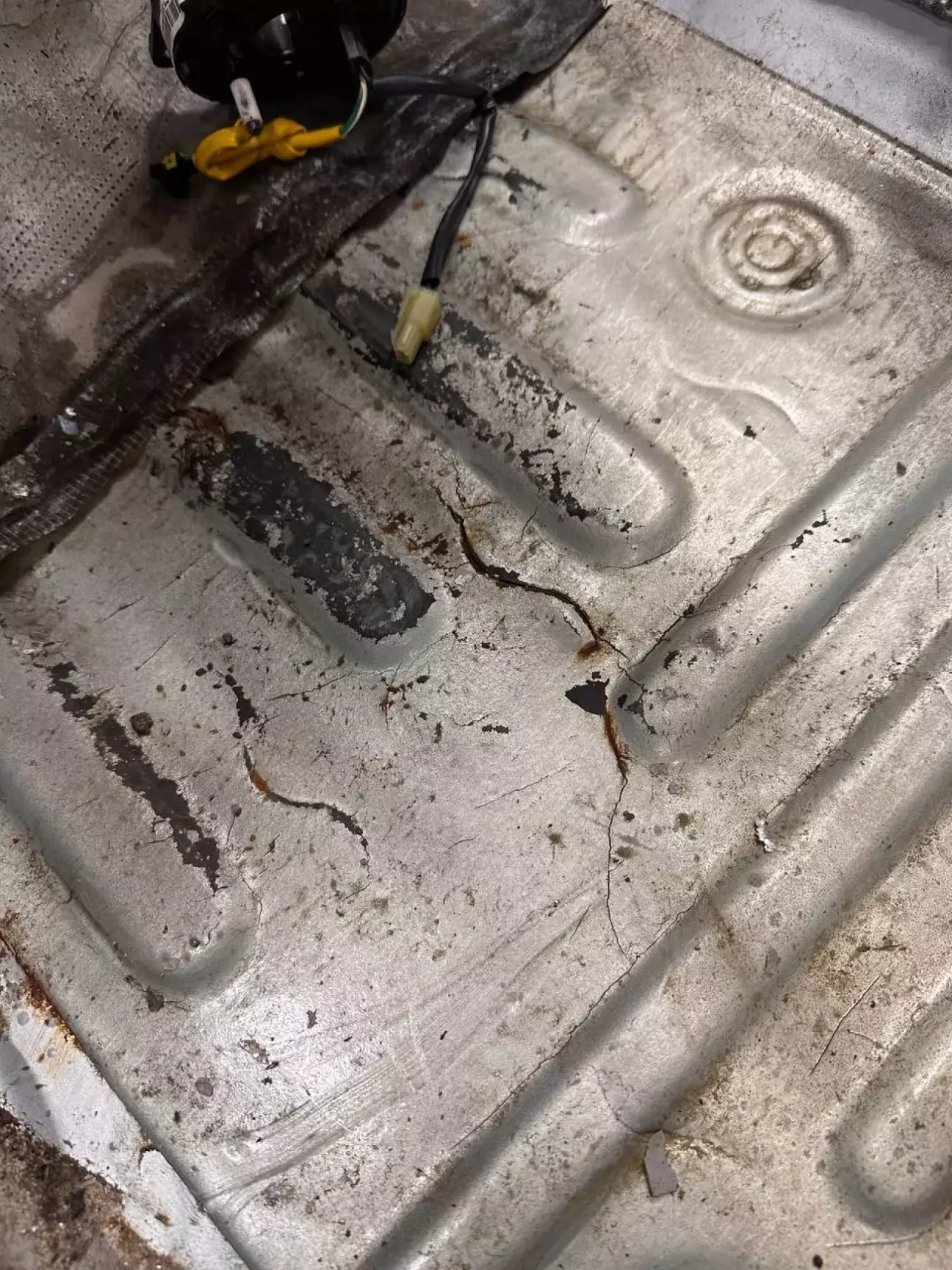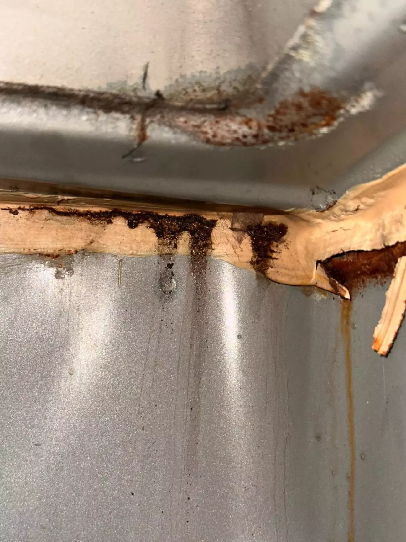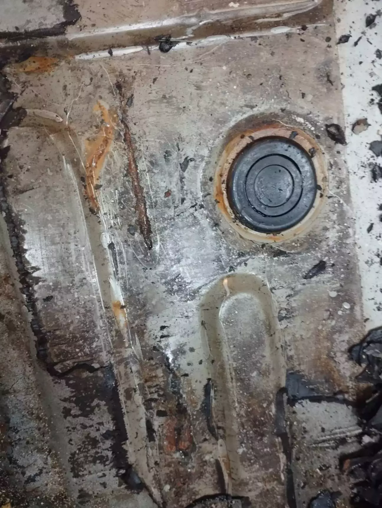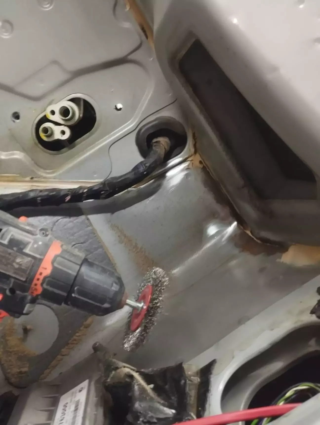 Мало кто хотел браться за эту работу, но одного отчаянного человека я всё таки нашел. Вскрытие показало то, что в целом и ожидалось. Пересохший и уже отваливающийся от корозии герметик. Всё было зачищено. Пол тоже начал давать о себе знать, там тоже всё протравили, и заделали.