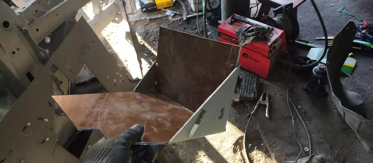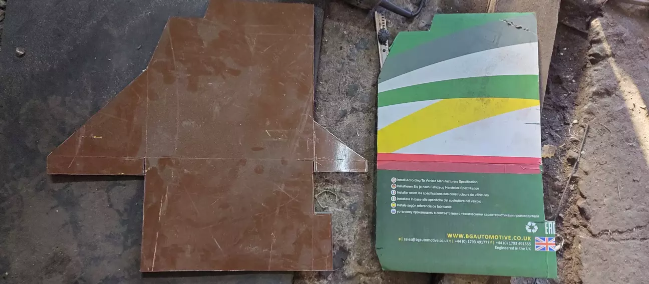Так як моя MPS досталася мені не зовсім у заводському виконанні,а саме із фронтальним інтеркулером та холодним випуском з під крила.То одразу була ідея зробити імпровізований короб щоб не закидувало водою та піском філтр,хоч він був ще у захистній сітці.Тому за основу був взят кусок рекламного композитного матеріалу,та картон і ножиці для шаблона)