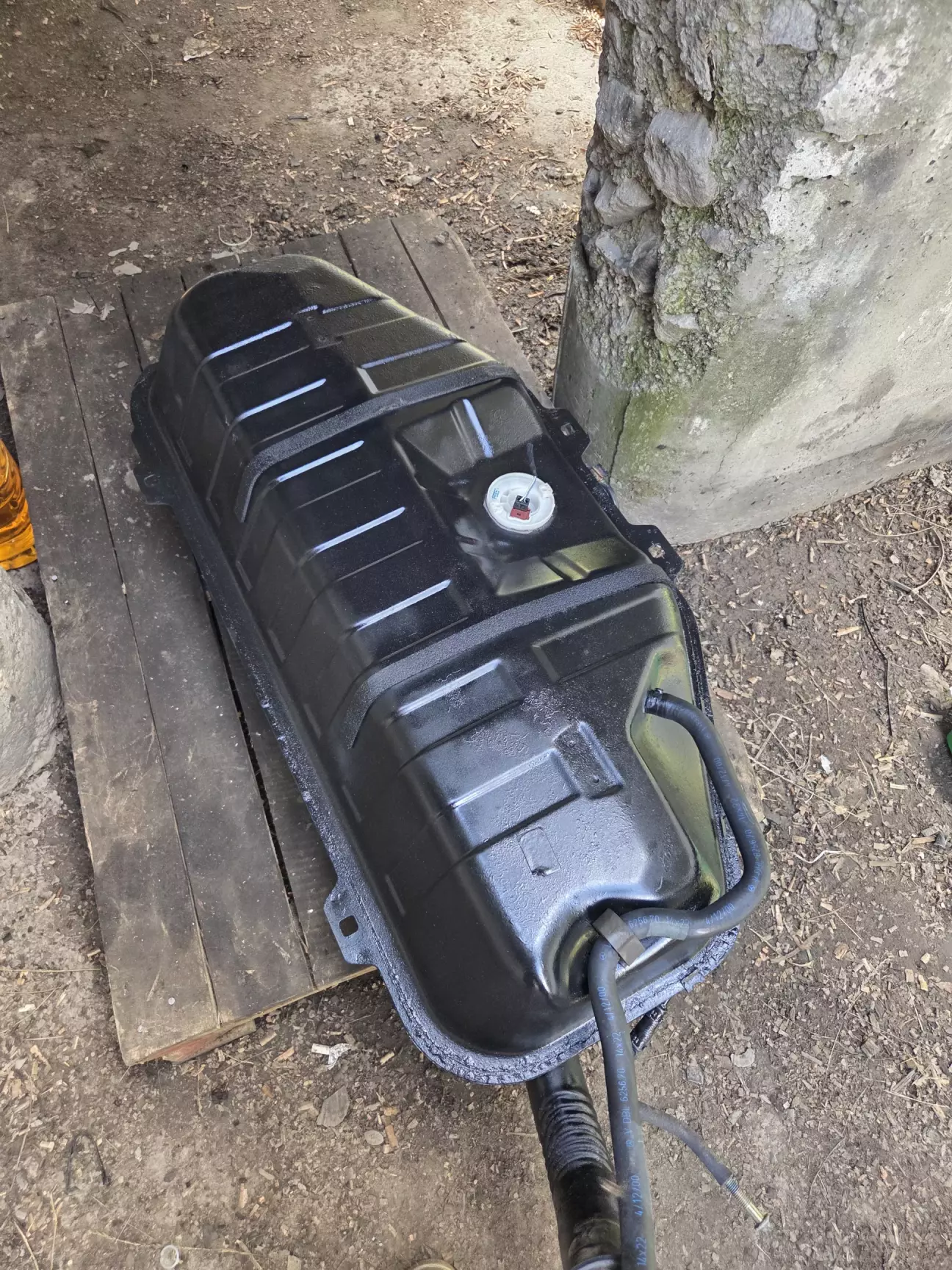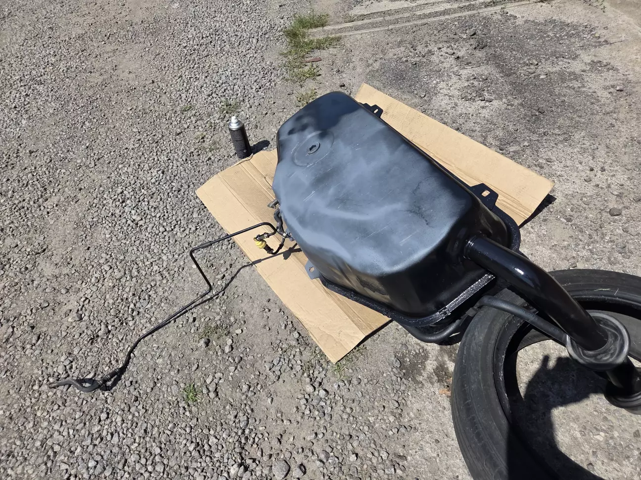 И вот, спустя два года после покупки, удача — удалось найти бак в отличном состоянии, без деформаций и коррозии. Перед установкой решил привести его в идеальный вид: зачистил мелкие рыжики, обработал эпоксидным грунтом и покрасил чёрной глянцевой Montana — получилось красиво и аккуратно, как с завода.