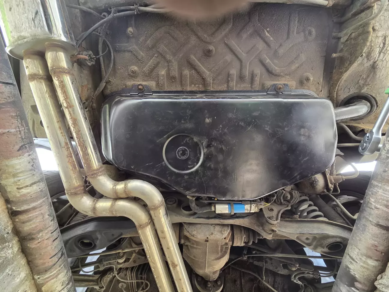 Теперь бак вмещает полный объём, стрелка уровня топлива наконец-то показывает ниже середины, и можно ездить без постоянного страха, что бензин закончится внезапно. Старый бак, как оказалось, был не только подмят снизу, но и втянут вакуумом сверху, так что реальный объём был максимум треть от штатного — неудивительно, что не хватало даже на сотню километров.