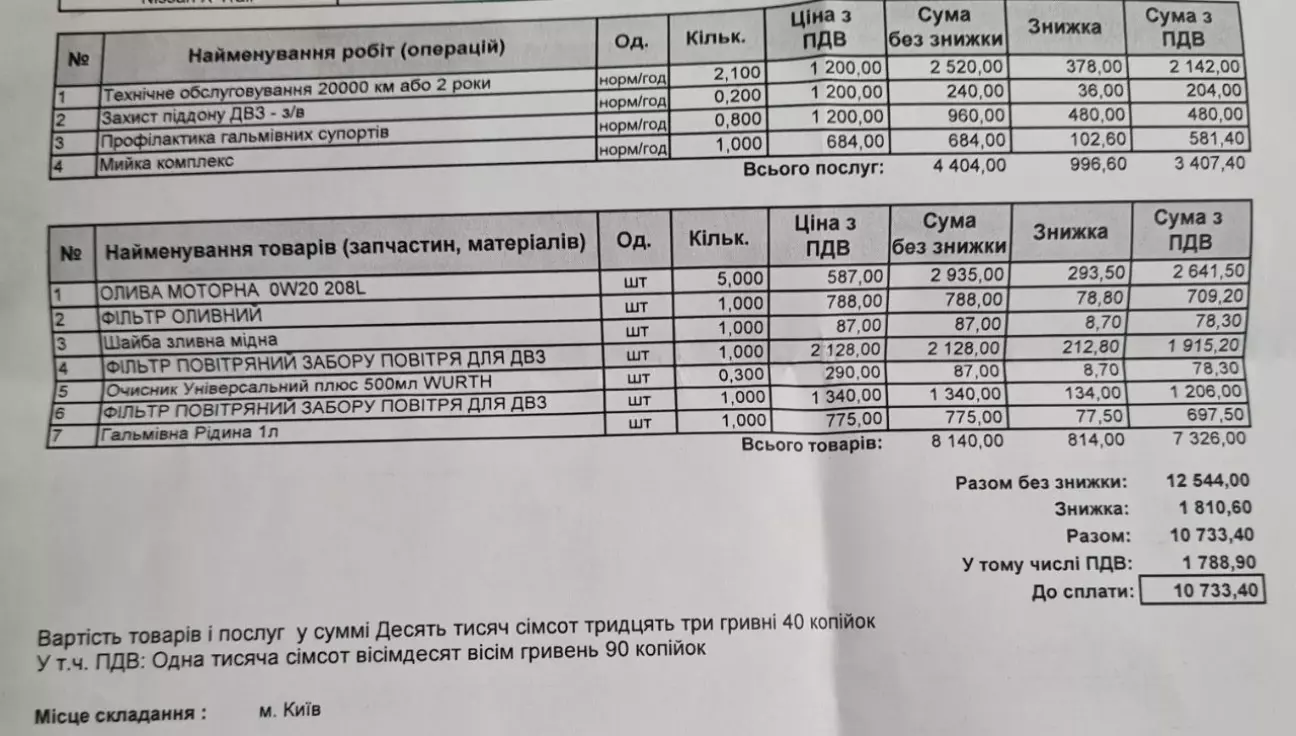 Поки робили ТО подивився на нового Кашкая і Жука, таке враження, що у Ніссана вирішили робити повну уніфікацію по салонам. Приборка і блок мультимедія з кліматом майже нічим не відрізняється у Кашкая, а у Жука трохи відрізняється блок клімату. На жаль в Україну не возять офіційно Арію, там наче новий підхід Ніссана до комплектування салону. Десь за 2 з хвостиком години зробили ТО + мийку, ось такий чек вийшов: