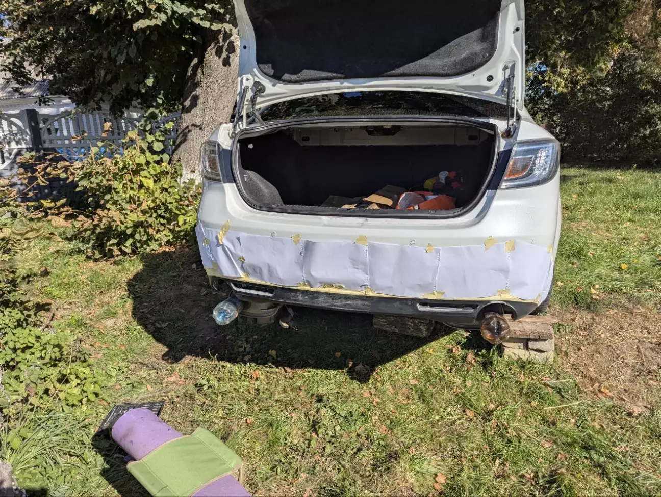 Помив бампер, обклеїв малярною стрічкою, пройшовся 360кою, 500кою, 1000кою і 2000кою. Потім в 3-4 тонких слоя покрив фарбою: