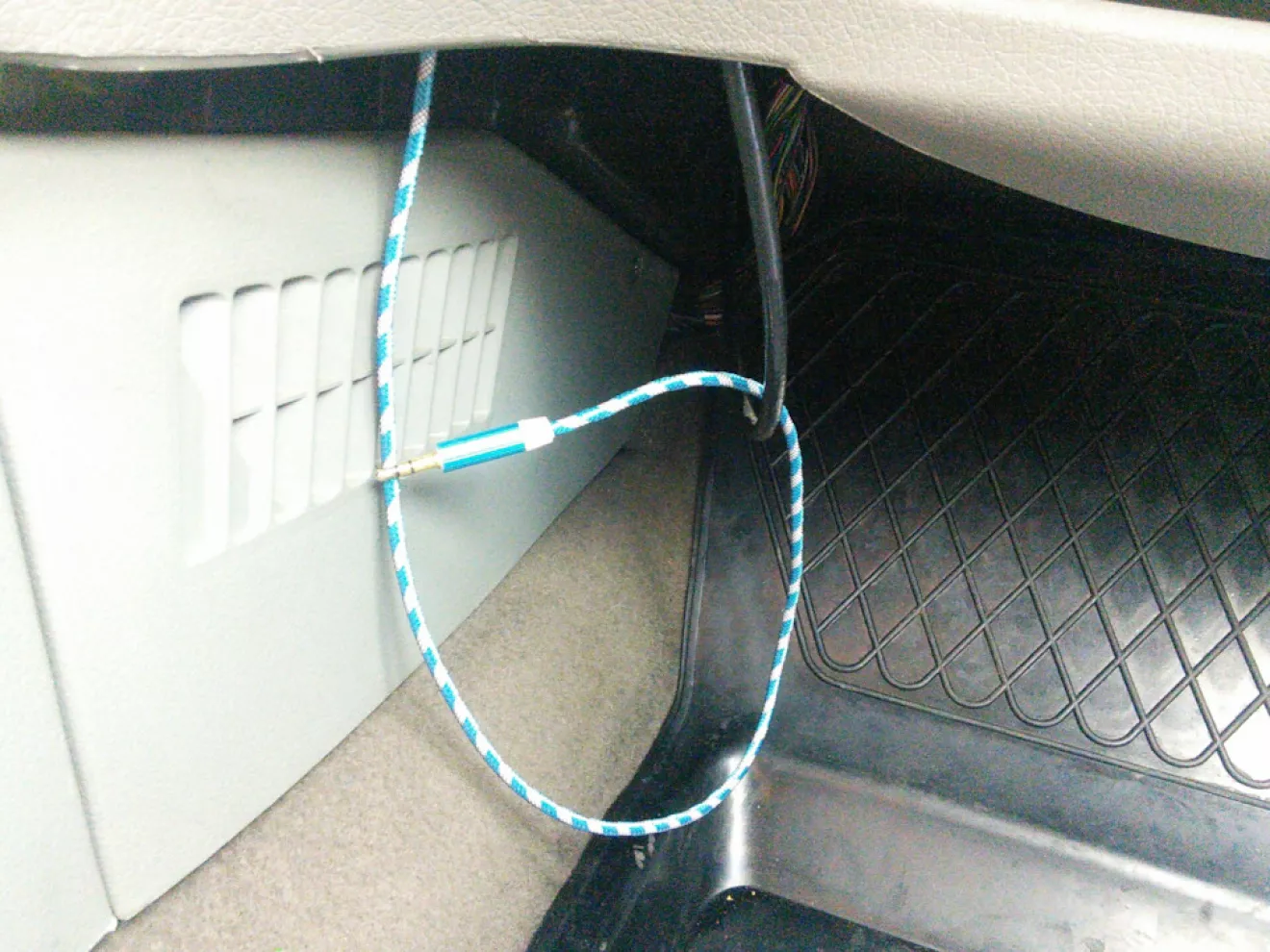 Купил самый дешёвый на первый раз провод, синего цвета, и подключив вывел его справа у ног пассажира.