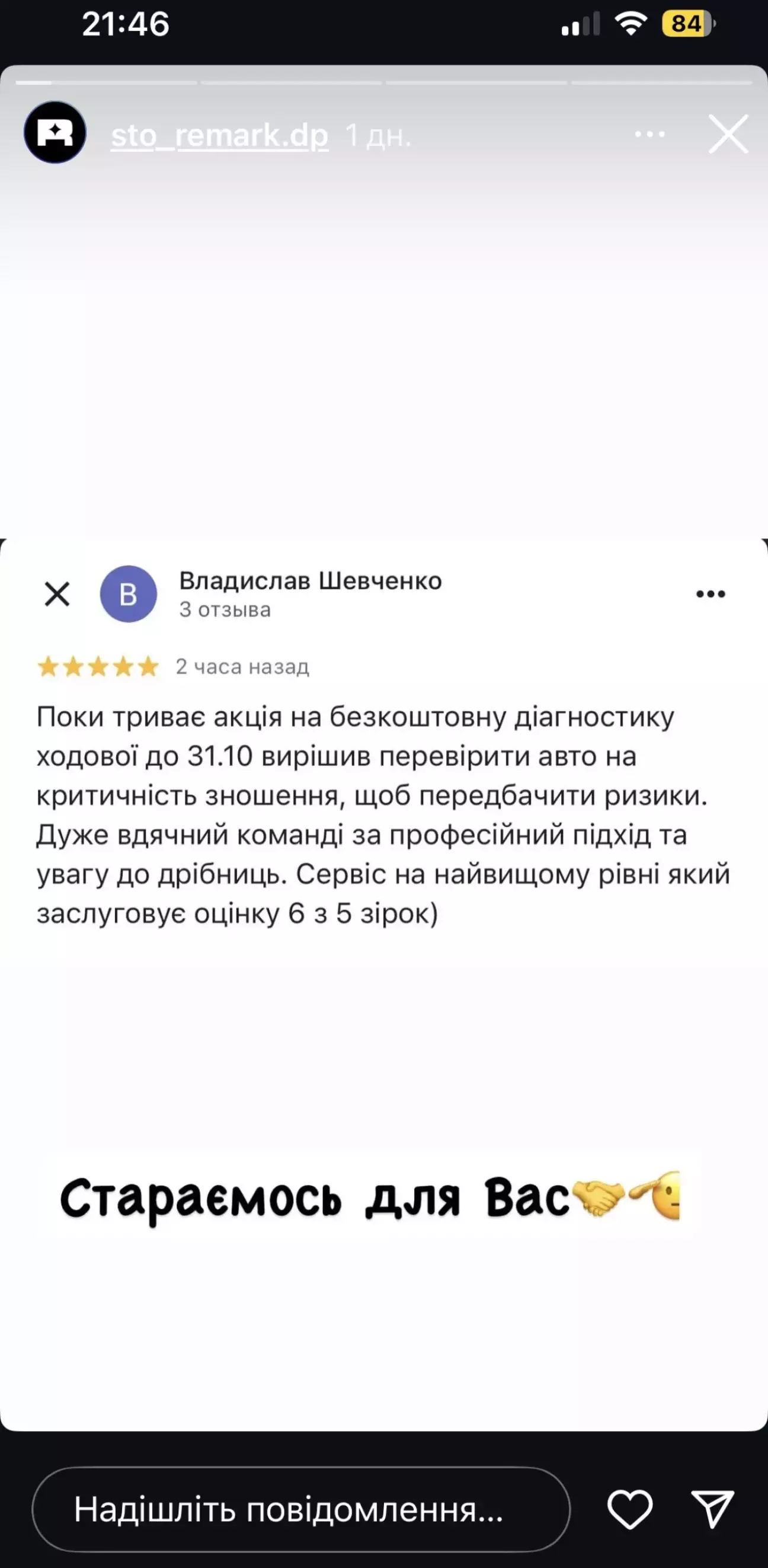 Всім привіт, ми наближаємось до 100 тис. пробігу тому час продіагностувати деталі підвіски. Випадково моніторячи Instagram, натрапив на рекламу безкоштовної діагностики ходової до 31.10 на Ремарк СТО в Дніпрі. В принципі я знав, що в мене трішки потекли 3/4 амортизатори, в цей раз до них приєднався і 4ий. В принципі це все, що можна віднести до проблемних питань, все інше практично в ідеалі. Незважаючи, що в оголошенні було вказано лише діагностика ходової, хлопці продіагностували все, куди можна було залізти, від стану рідин, тормозних дисків та колодок до стану подушок двигуна. Тому висновки зроблені та враховані в подальшу діяльність😁