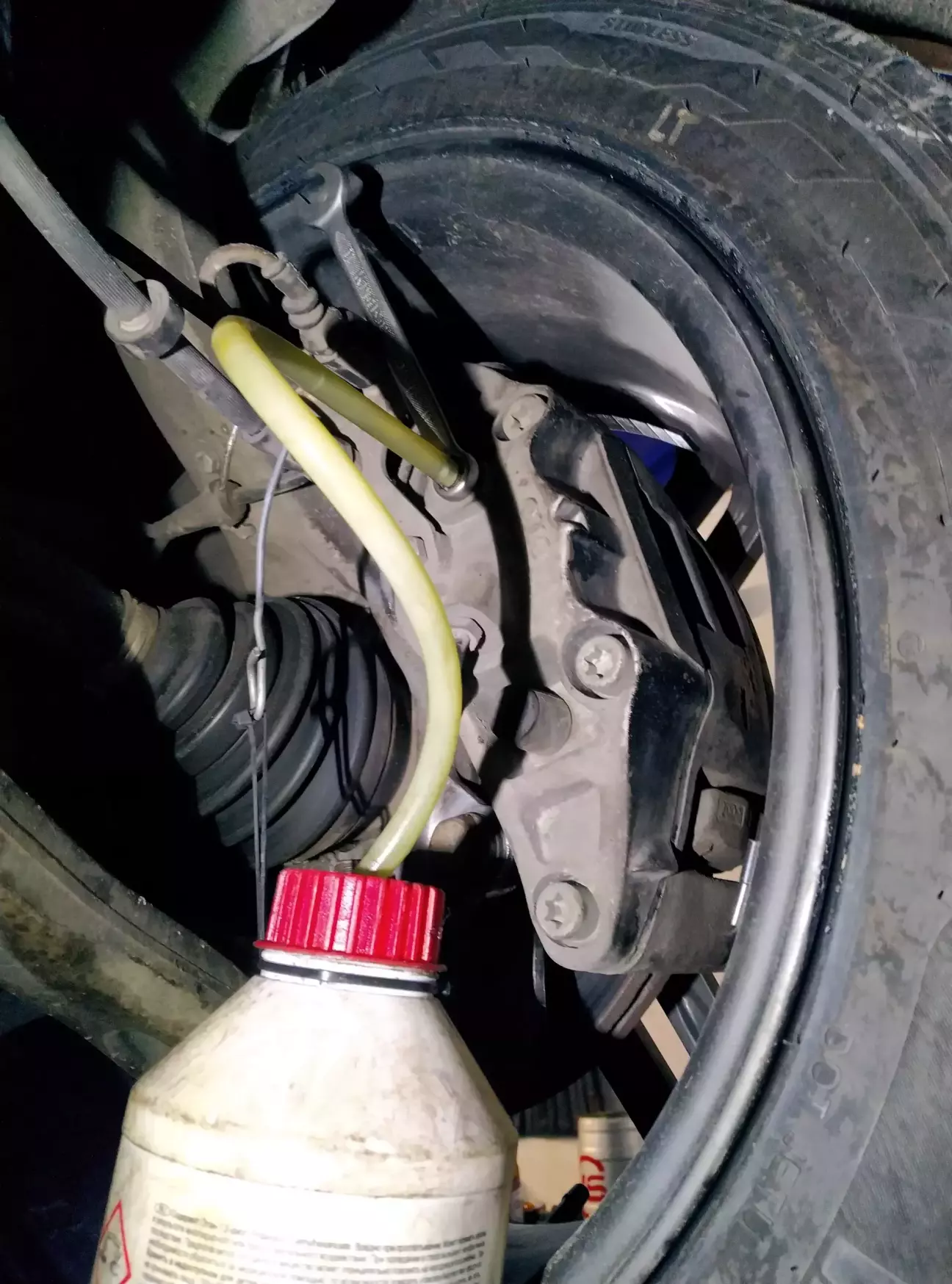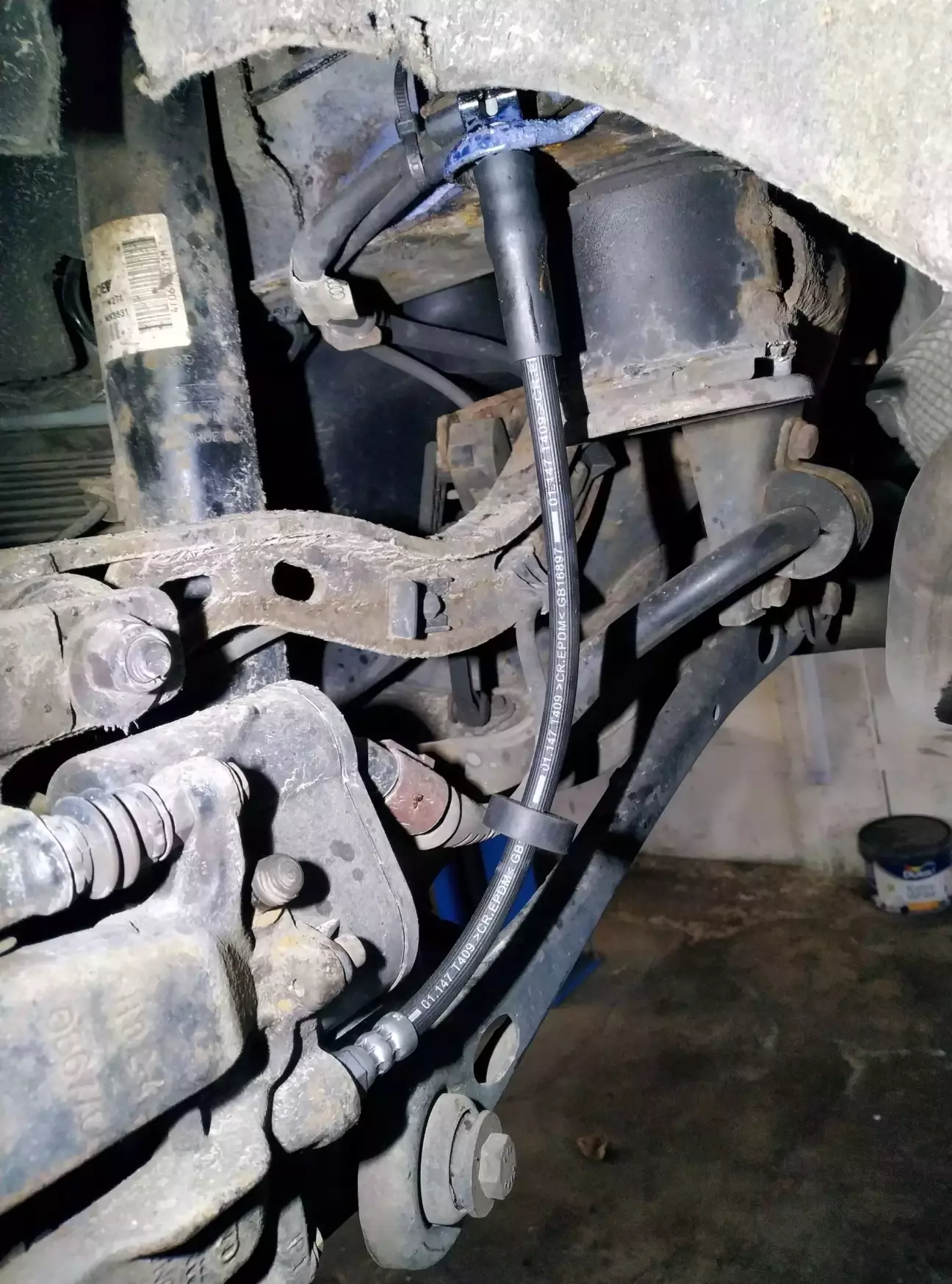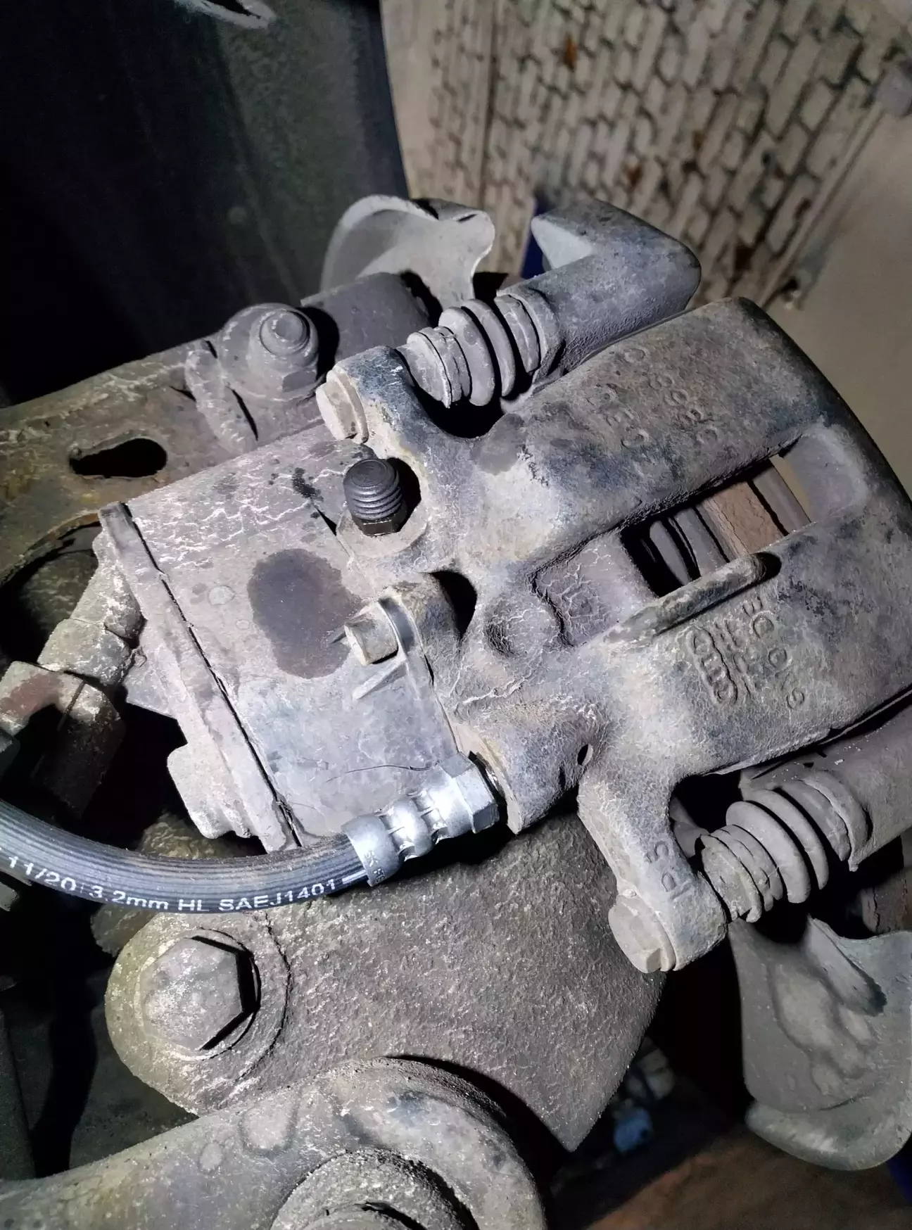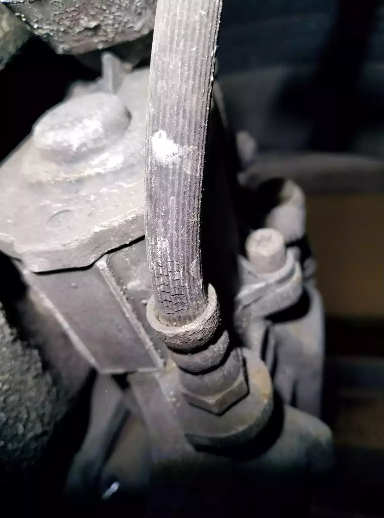Міняємо передні гальмівні трубки. Мені несподобалась корозія під захисним пильником де йде завальцовка резини в метал. Хотів міняти тільки резинові трубки, але права коротка металева труба почала крутитися разом зі штуцером. Замовив додатково 2 оригінальні трубки і поміняв. Заодно ще раз замінив повністю рідину.