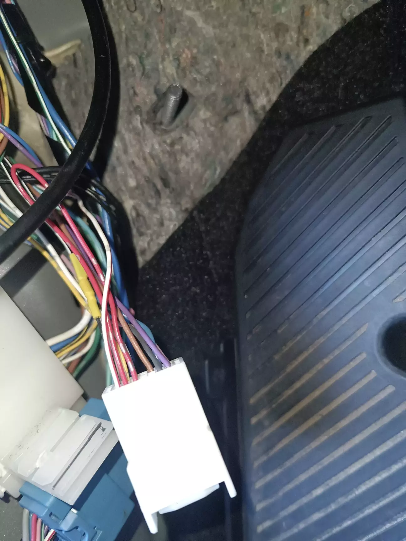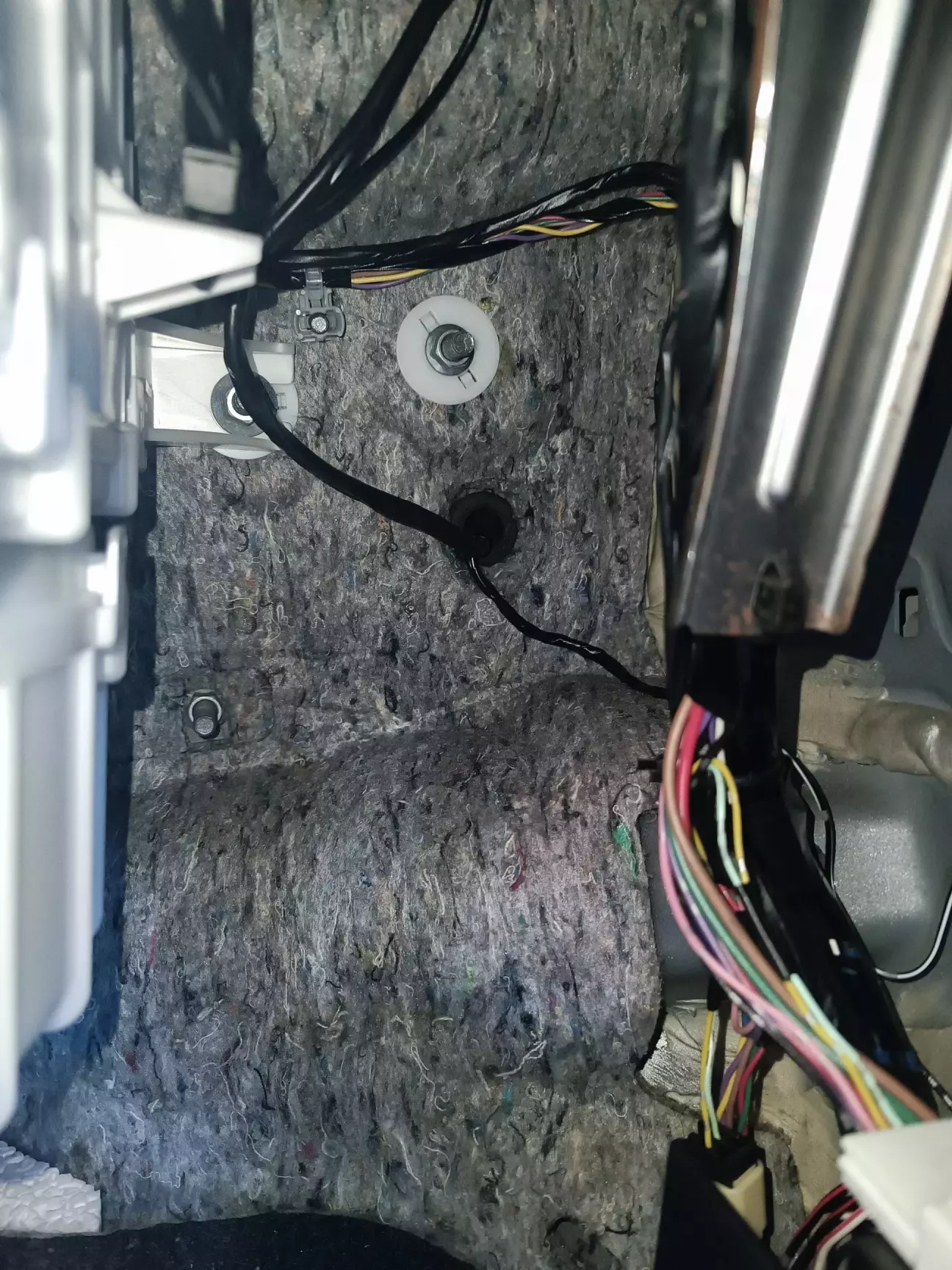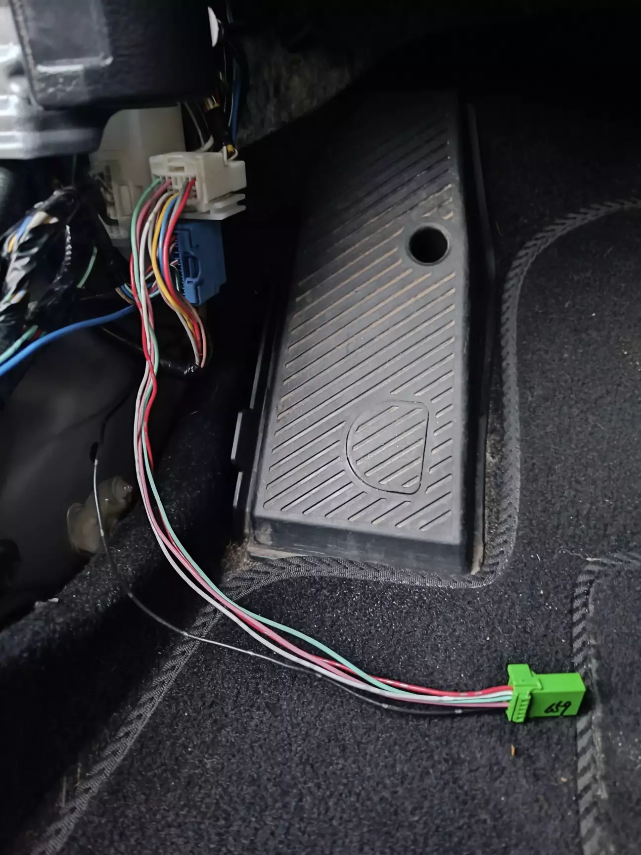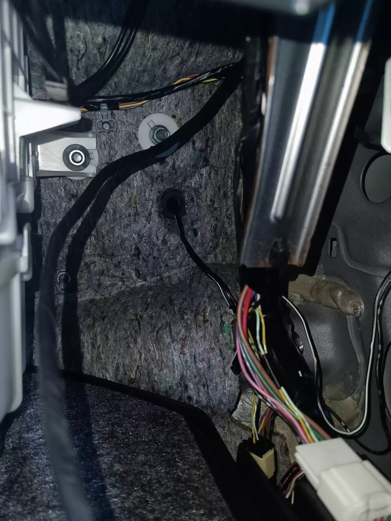 З попереднього етапу в мене лишався нікуди не під'єднаним роз'єм на камеру. По штатному камера має бути ззаду, але нічого не заважає встановити її зпереду. Лише +12В доведеться подавати не від заднього ходу, а примусово, наприклад через кнопку. Як би нічого такого складного, протягнути чотири дроти від дзеркала заднього виду до переднього бамперу. Але для мене то ціла катастрофа, бо не хочеться робити лишні дірки в кузові, та чіпати заводські жгути. Штатно всі проводи з салону під капот йдуть через єдиний отвір з лівого боку. І там ой як не зручно їх протягувань, треба товстелезний заводський жгут проводів розмотувати. Один раз я вже таке робив, коли ставив систему підсвітку поворотів AFS і повторювати нема геть ніякого бажання.Тож я знов надумав робити нестандартно - протягнути проводи з правого боку за бардачком. Там є гумова заглушка, через яку я раніше протягував дроти на штатну сирену, тож буде на порядок простіше. І довжина проводів вийде меншою.